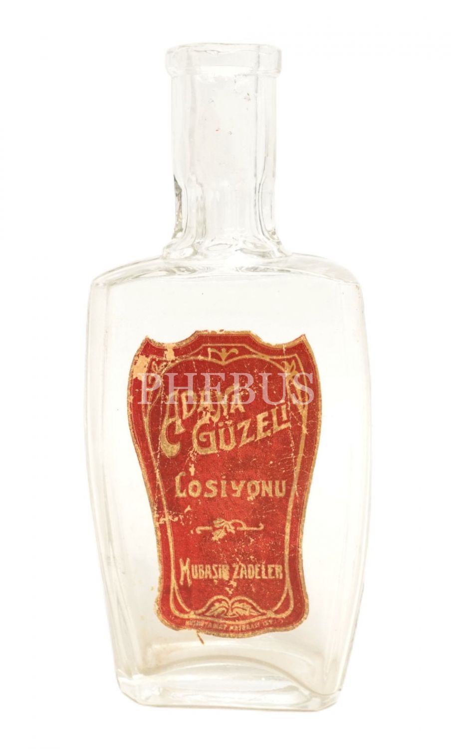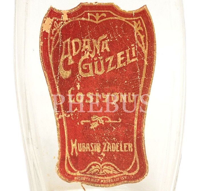 "ADANA GÜZELİ Losiyonu - Mubaşir Zadeler" etiketli losyon şişesi, Hüsn-ü tabiat matbaası, 14x6x3 cm