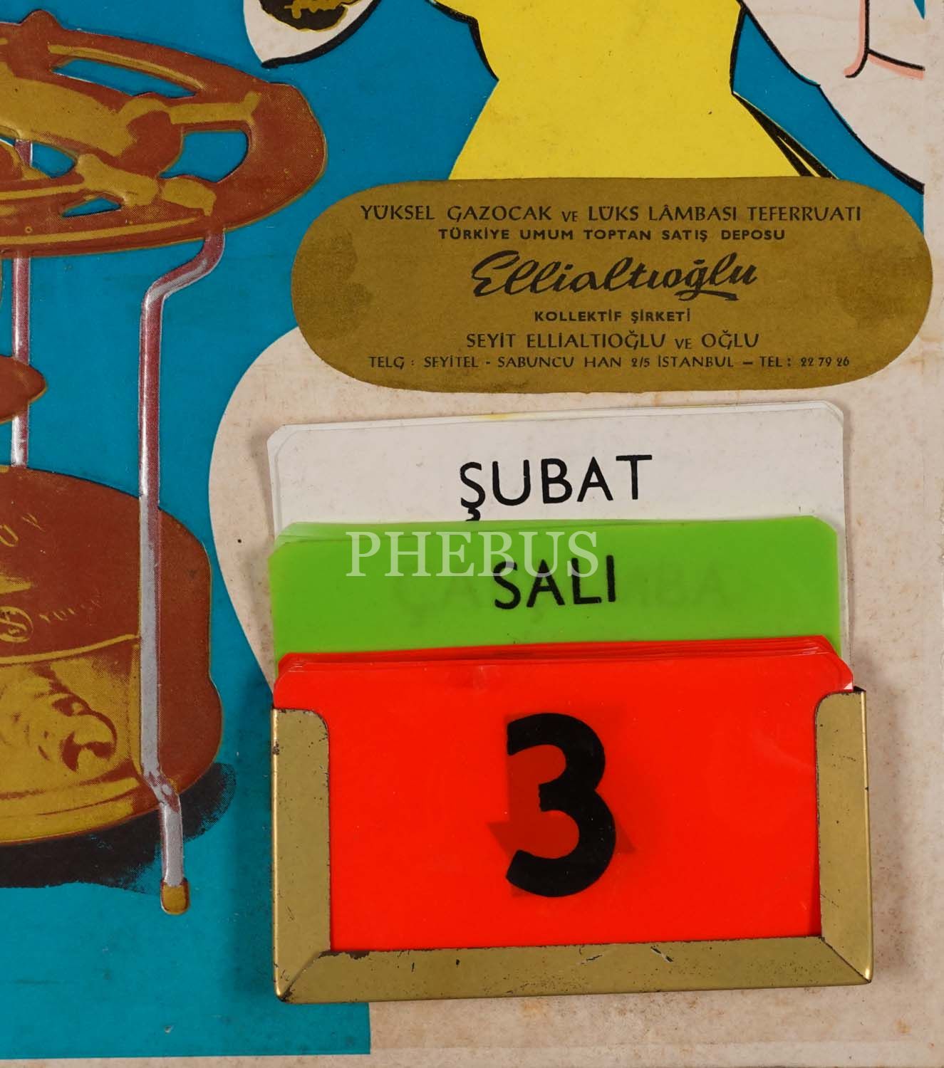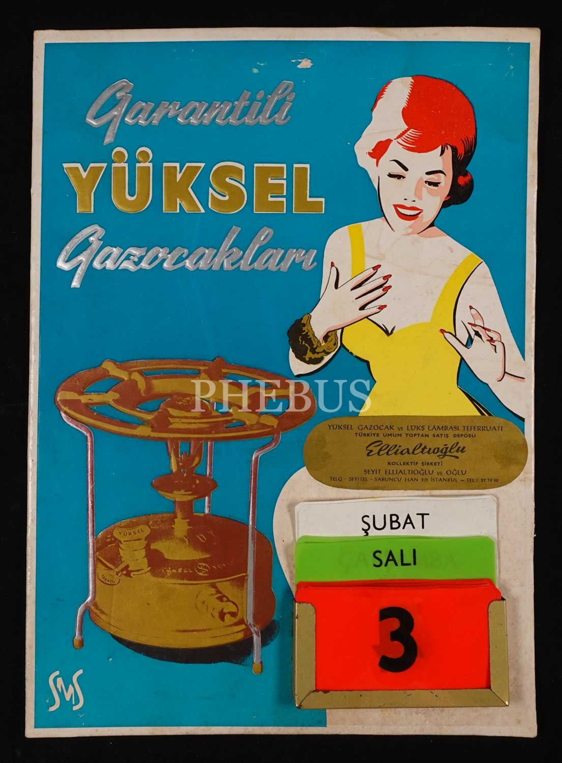 Garantili YÜKSEL Gazocakları reklamlı duvar takvimi, Damga ve Belediye İlan Pullu, "Seyit Ellialtıoğlu" damgalı, 24x34 cm