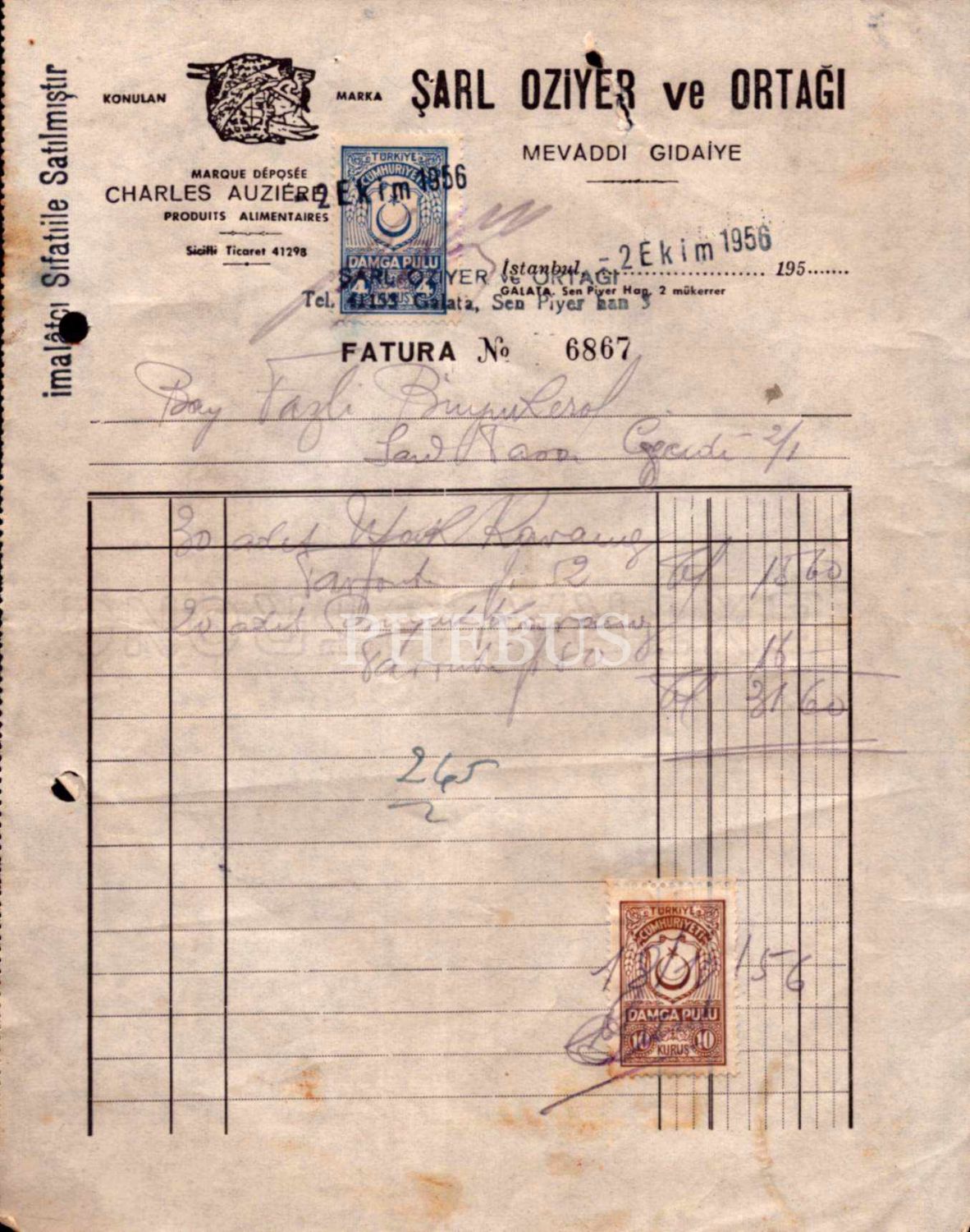 ŞARL OZİYER ve ORTAĞI (Mevâddı Gıdaiye) antetli ve 2 Ekim 1956 tarihli fatura, Damga Pullu, 17x22 cm