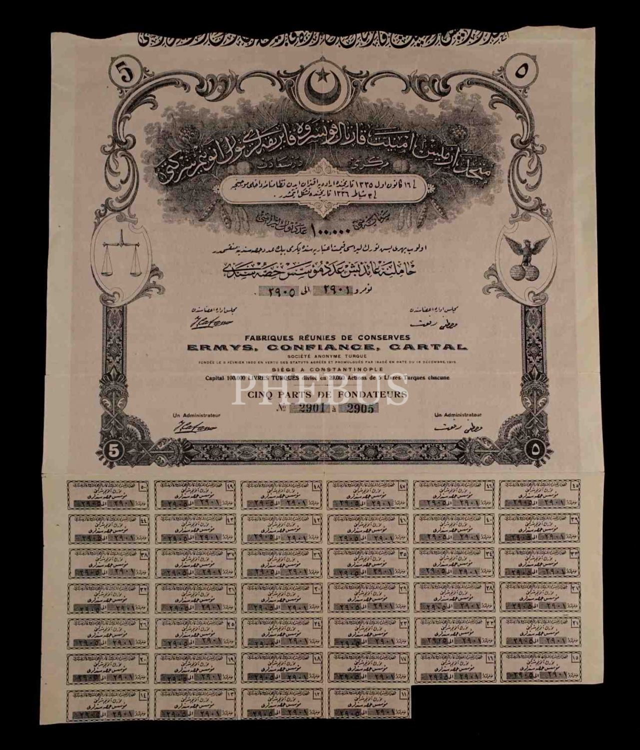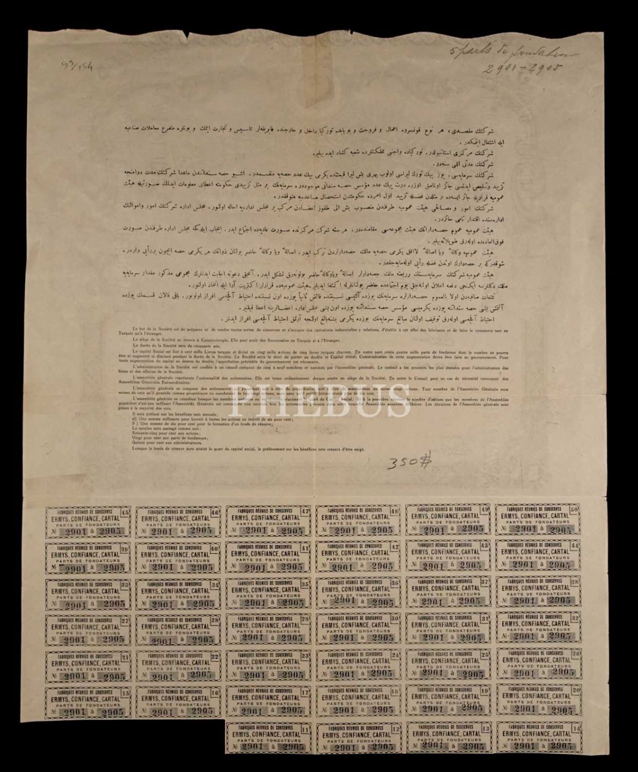 Osmanlıca ve Fransızca "ERMYS" [Ermis] Konserve Fabrikası hisse senedi, 37x30 cm
