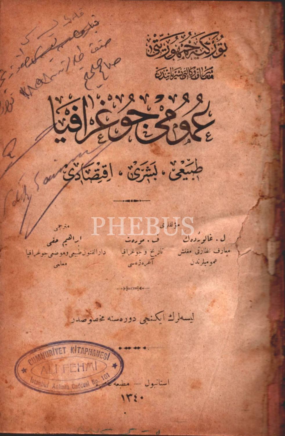 UMÛMÎ COĞRAFYA (Tabîî, Beşerî, İktisâdî- 1. Cilt), L. Galouedec & F. Maurette, çev. İbrahim Hakkı [Akyol], Matbaa-i Amire, İstanbul 1340, 456 s., 15x22 cm