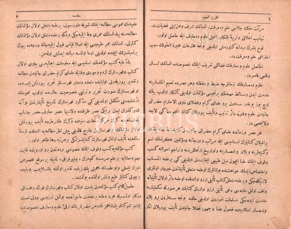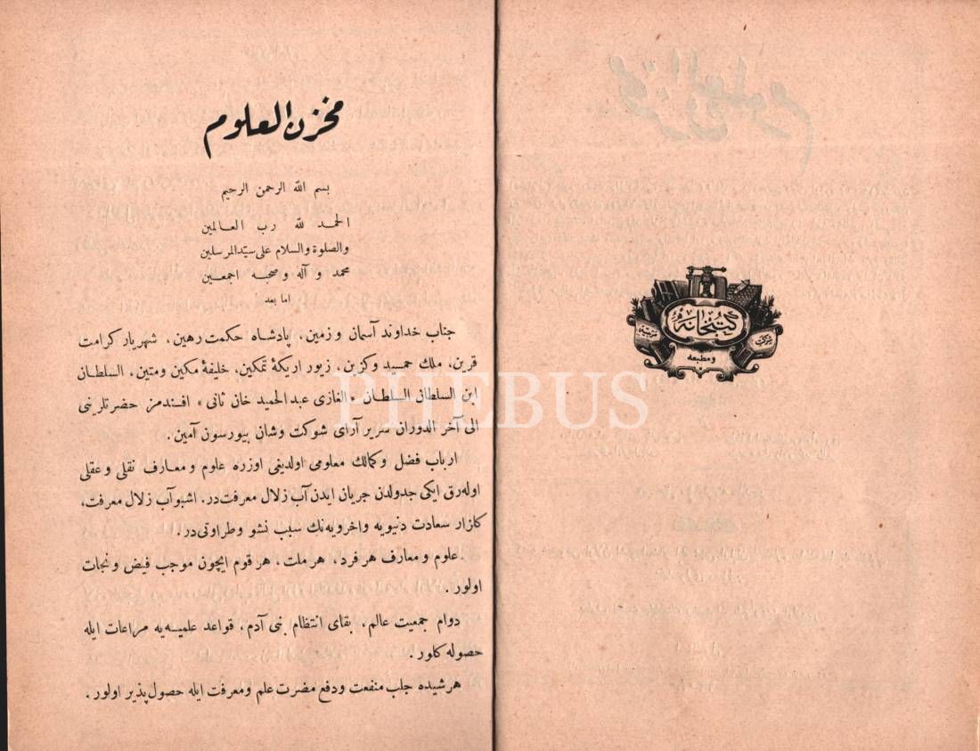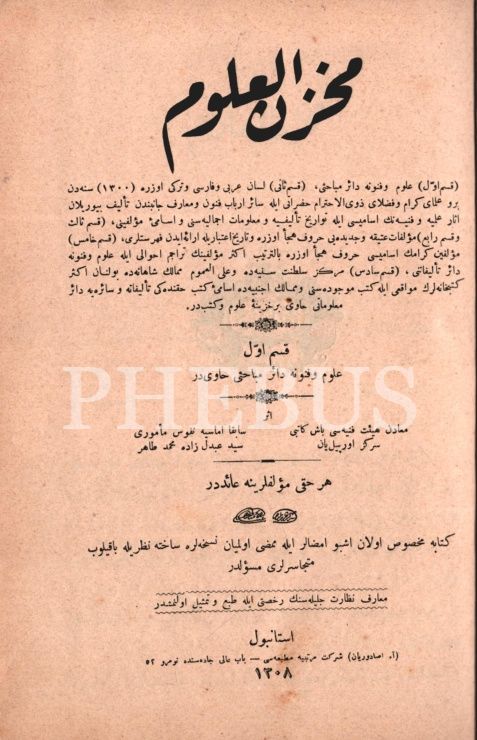 Üsküdar Mekteb-i Ravza-i Terakki´nin Osmanlı armalı ve ay yıldızlı mükâfat cildinde MAHZENÜ´L-ULÛM- 1. Kısım, Serkiz Orpilyan & Seyyid Abdülzâde Mehmed Tahir, A. Asaduryan Şirket-i Mürettibiye Matbaası, İstanbul 1308, 339 s., 17x24 cm