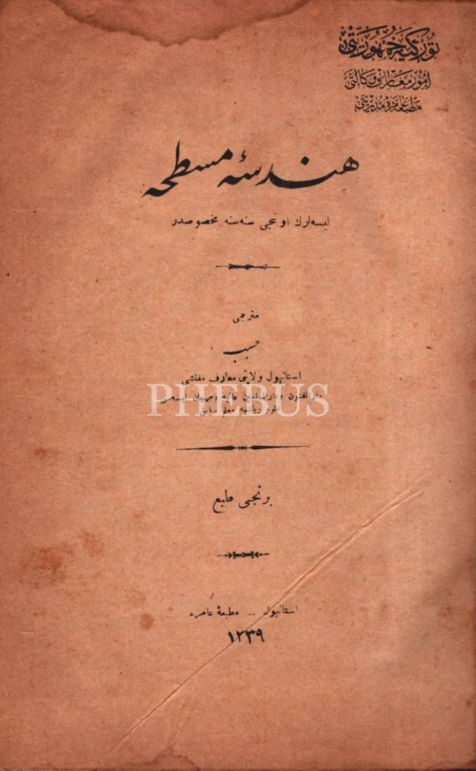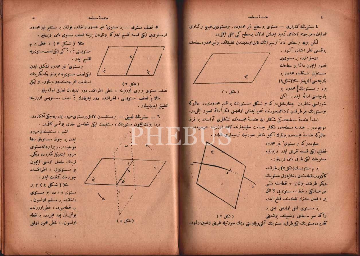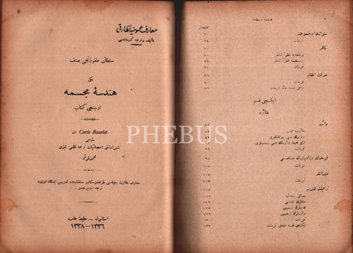 2 eser bir arada: HENDESE-İ MUSATTAHA, çev. Hasib, Matbaa-i Amire, İstanbul 1339, 333 s.; YENİ HENDESE-İ MÜCESSEME- Üçüncü Kitâb), Carlo Bourlet, çev. Mehmed Fuad, Matbaa-i Amire, İstanbul 1338, 236 s., 17x23 cm