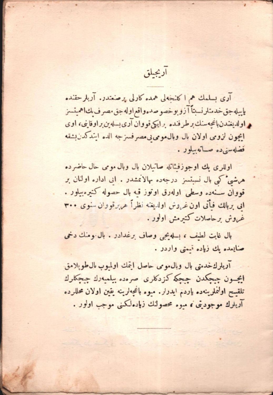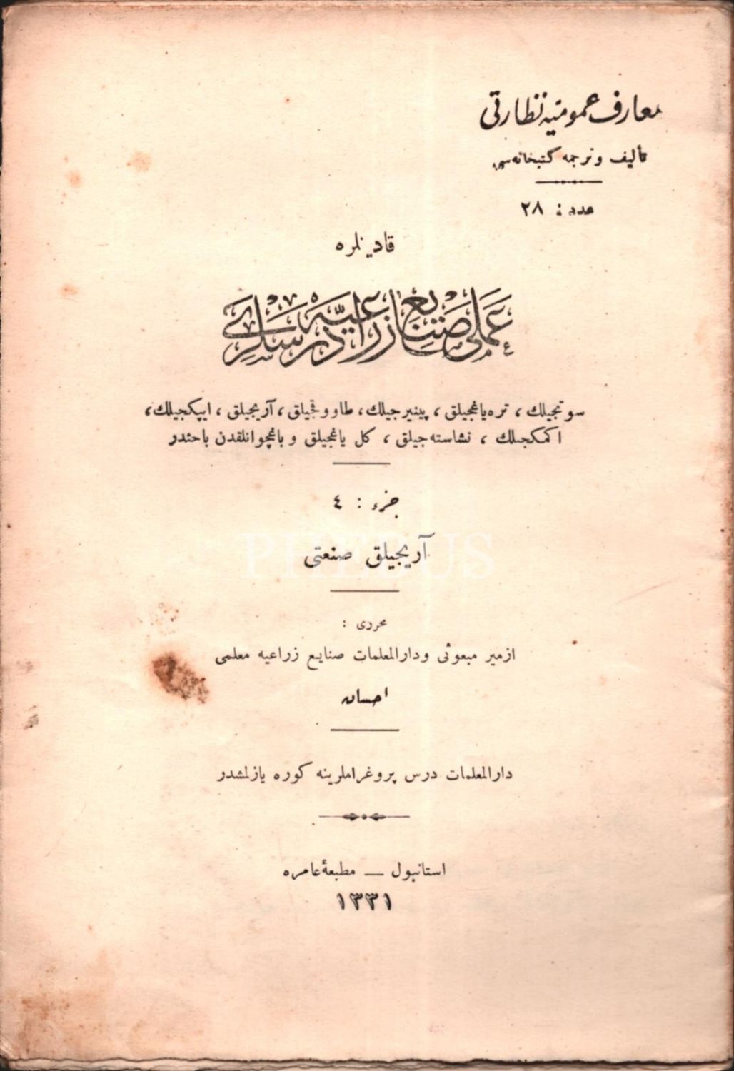 KADINLARA AMELÎ SANÂYİ-İ ZİRÂİYYE DERSLERİ (4. Kısım: Arıcılık San´atı), İhsan, Matbaa-i Amire, İstanbul 1331, 32 s., 14x21 cm