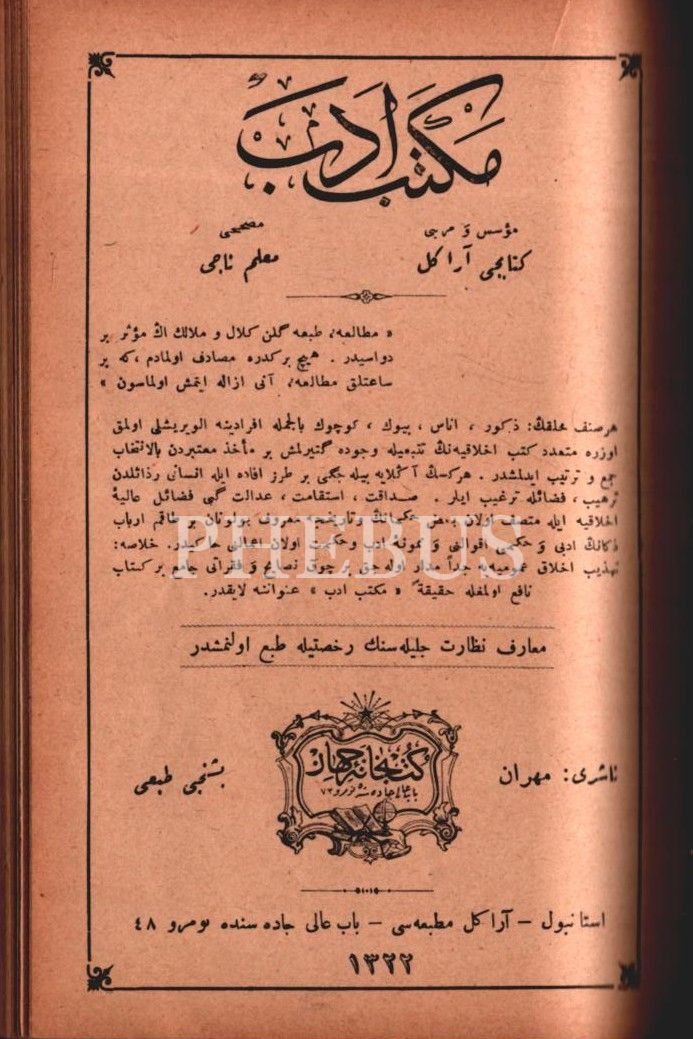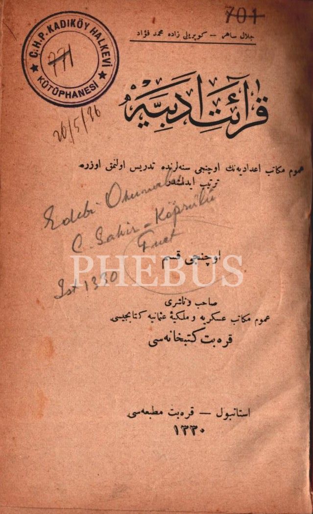 Çoklu eser: KIRÂAT-İ EDEBİYYE (Üçüncü Kısım), Celal Sahir & Köprülüzâde Mehmed Fuad, Karabet Matbaası, İstanbul 1330, 192 s.; MEKTEB-İ EDEB, tertib eden: Kitabcı Arakel, tashih eden: Muallim Naci, Kütübhane-i Cihan, İstanbul 1322, 199 s.;