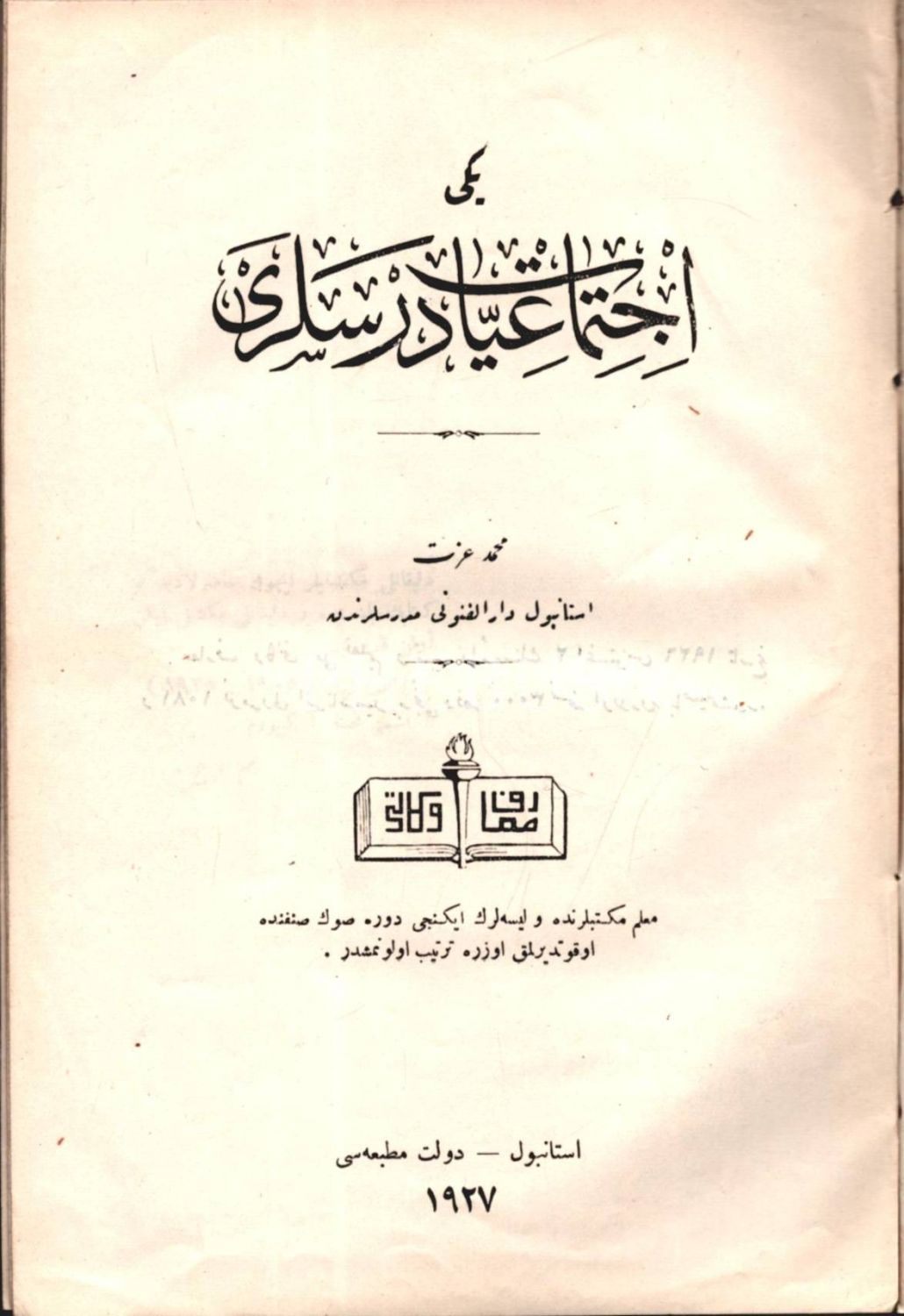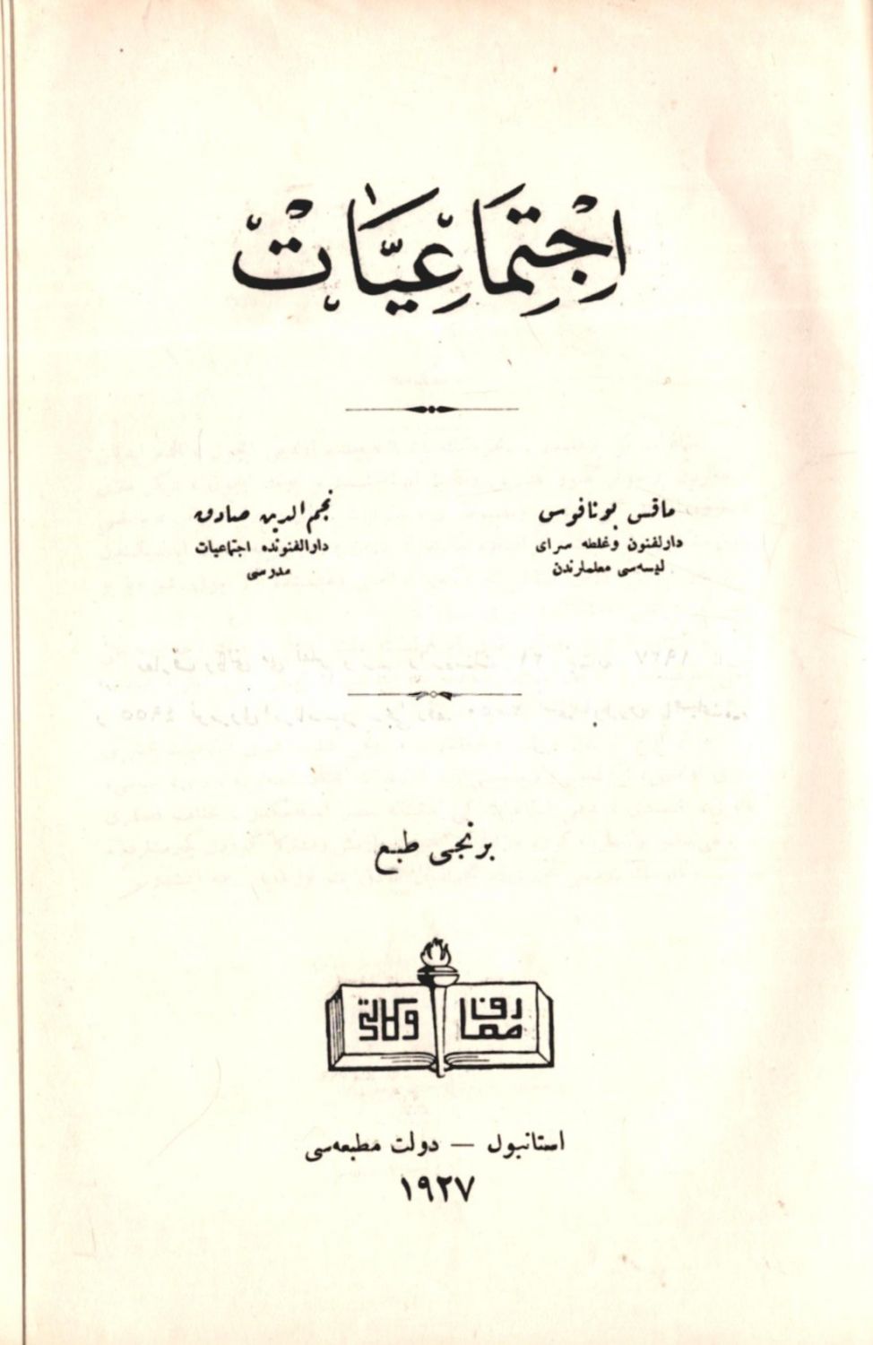 3 eser bir arada: YENİ İCTİMÂİYYÂT DERSLERİ, Mehmed İzzet, Devlet Matbaası, İstanbul 1927, 302 s.; İCTİMÂİYYÂT (1. Kitap), Max Bonnafous, çev. Necmeddin Sadık, Devlet Matbaası, İstanbul 1927, 215 s.;