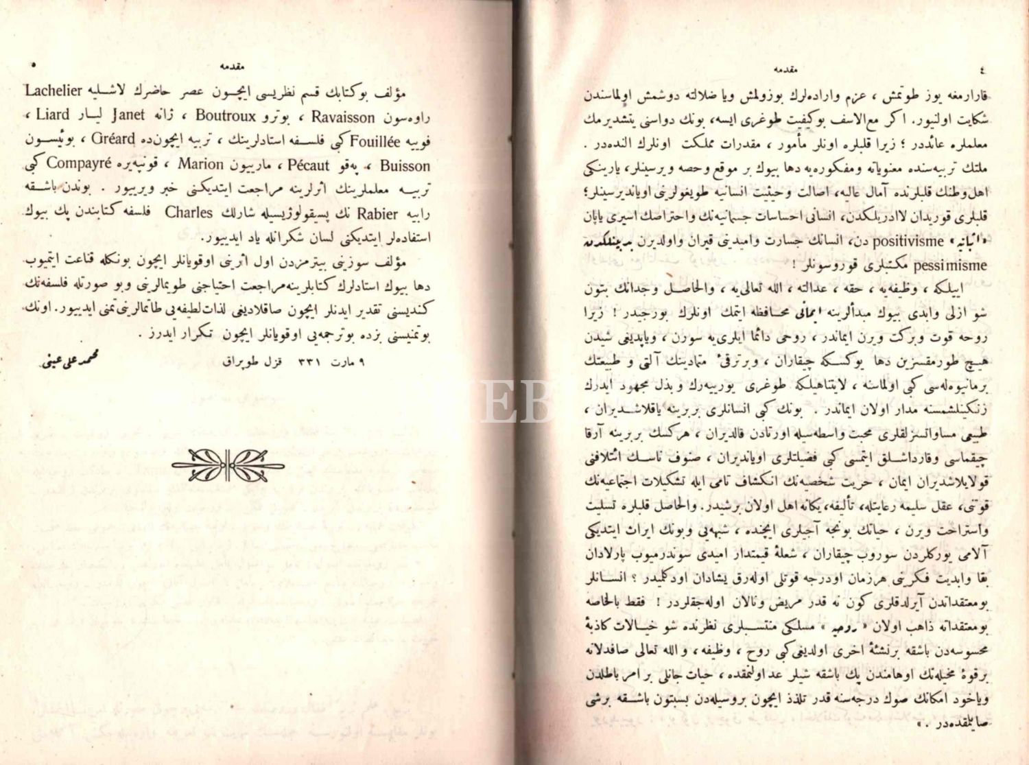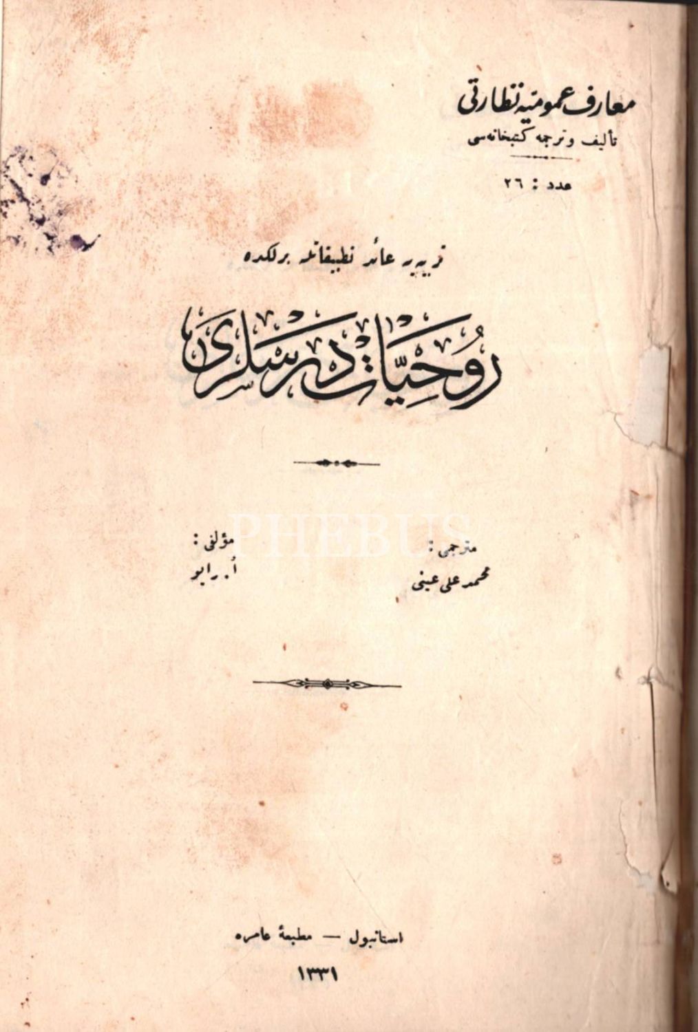TERBİYEYE ÂİD TATBÎKÂTLA BİRLİKDE RÛHİYYÂT DERSLERİ, E. Rabo, çev. Mehmed Ali Ayni, Matbaa-i Amire, İstanbul 1331, 503 s. (sayfa numaralandırmasında hata mevcut), 15x22 cm