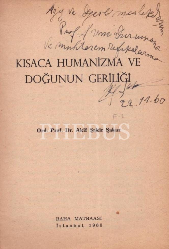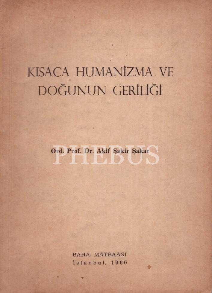 KISACA HUMANİZMA VE DOĞUNUN GERİLİĞİ, Akif Şakir Şakar, 1960, Baha Matbaası, 45 sayfa, 12x17 cm, İTHAFLI VE İMZALI...