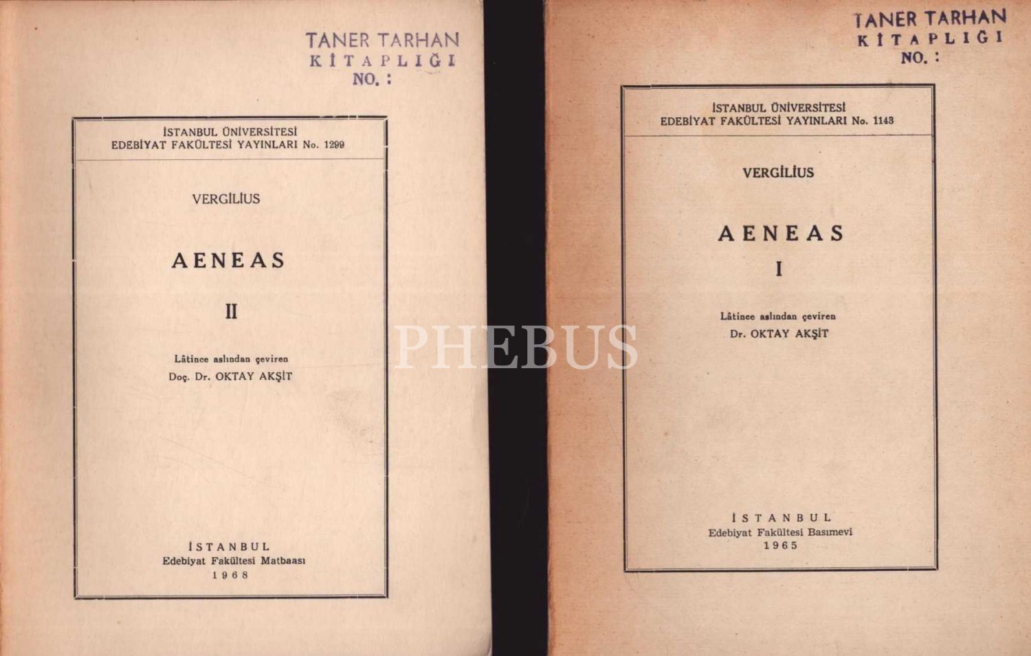 AENEAS (Cilt: I-II), Vergilius, Lâtince aslından çeviren: Oktay Akşit, 1965-68, Edebiyat Fakültesi Basımevi, 56+55 sayfa, her iki cilt de İTHAFLI VE İMZALI...