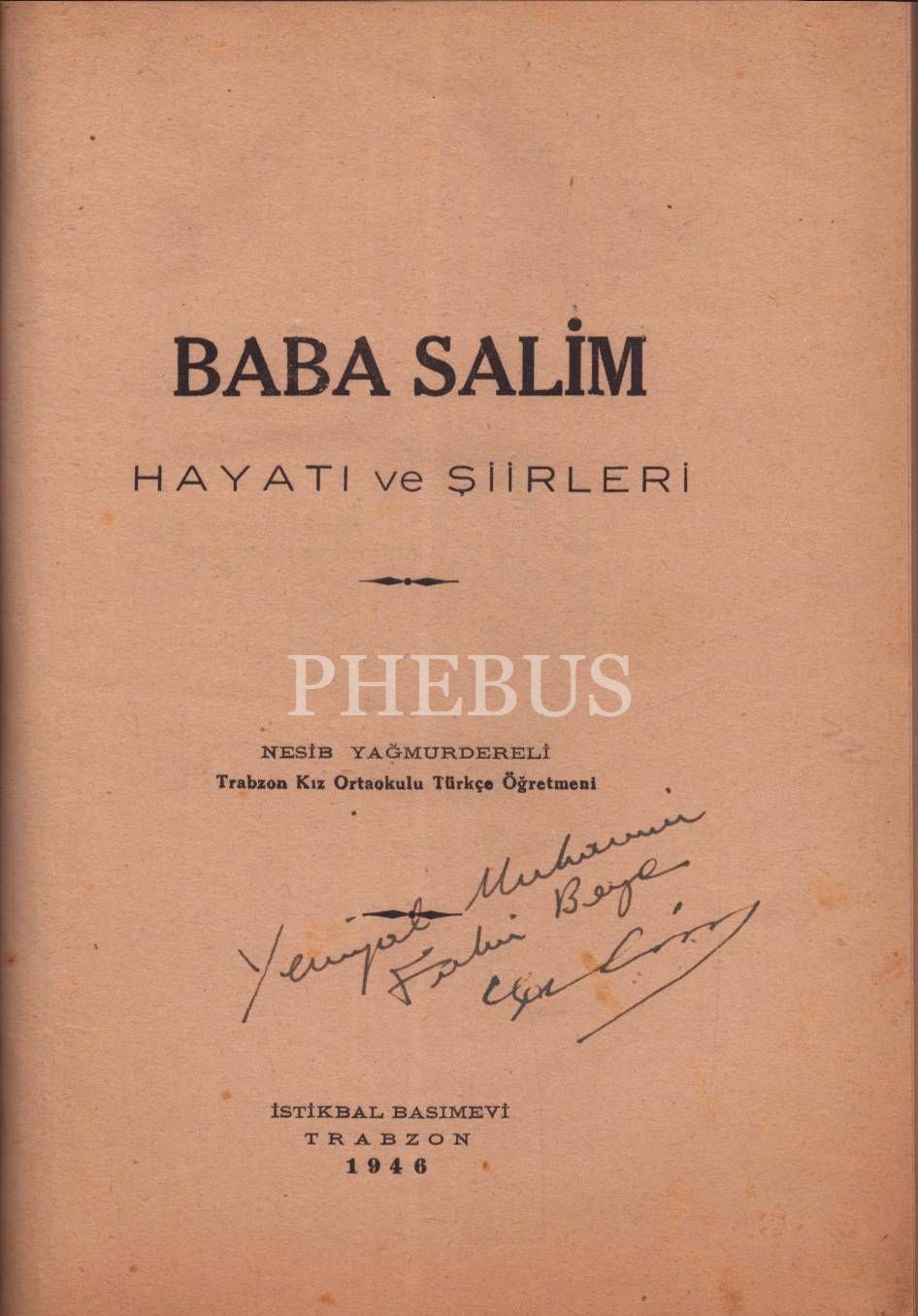 BABA SALİM (Hayatı ve Şiirleri), Nesib Yağmurdereli, 1946, İstikbal Basımevi (Trabzon), 202 sayfa, 17x24 cm, İTHAFLI VE İMZALI...