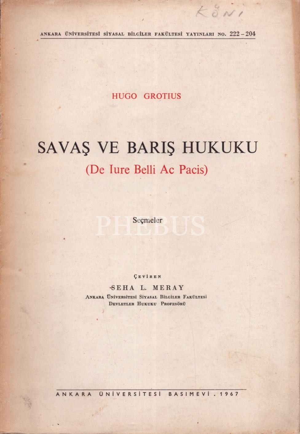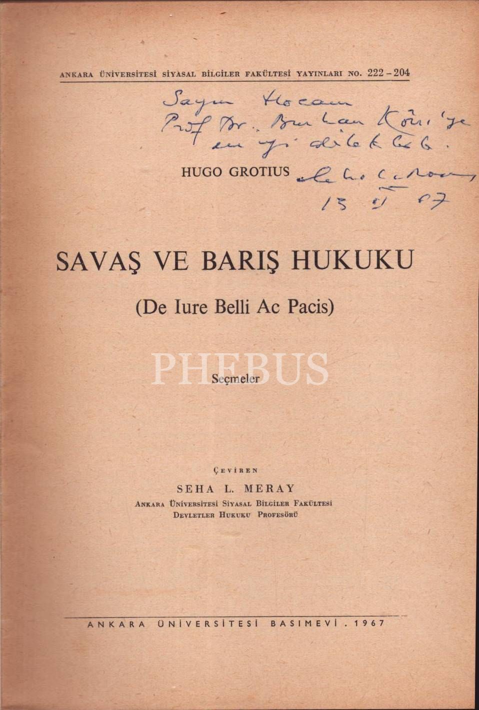 SAVAŞ VE BARIŞ HUKUKU (De Iure Belli Ac Pacis), Hugo Grotius, çeviren: Seha L. Meray, 1967, Ankara Üniversitesi Basımevi, 325 sayfa, 17x24 cm, çevirmeninden İTHAFLI VE İMZALI...