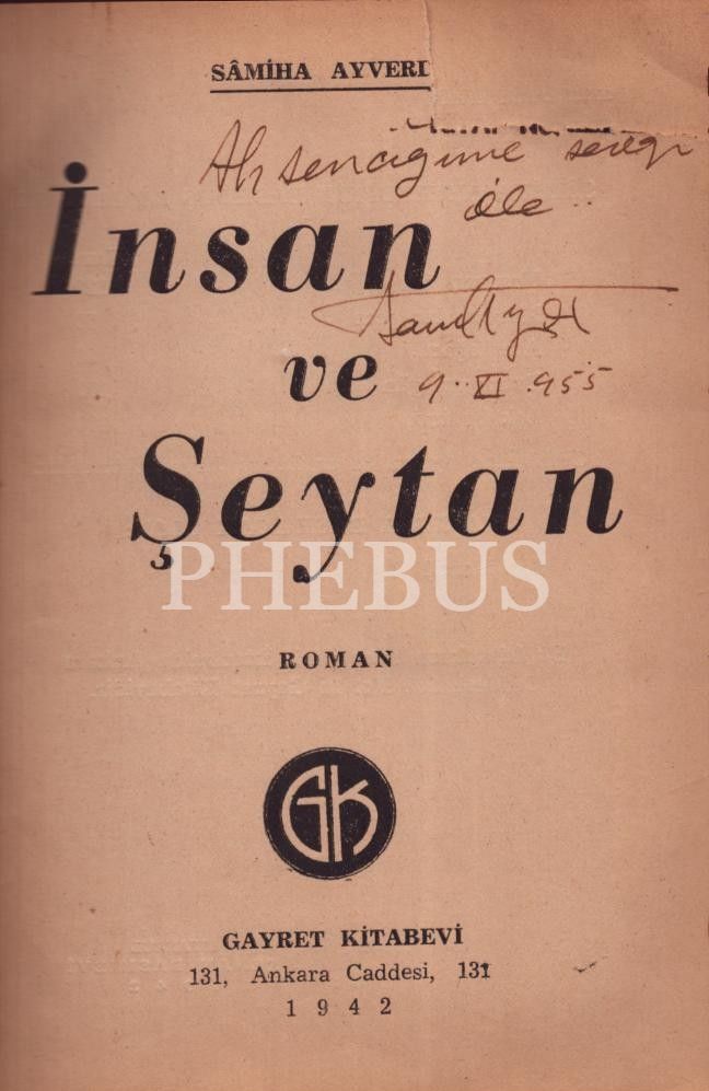 İNSAN VE ŞEYTAN (Roman), Sâmiha Ayverdi, 1942, Gayret Kitabevi, 267 sayfa, 13x18 cm, İTHAFLI VE İMZALI...