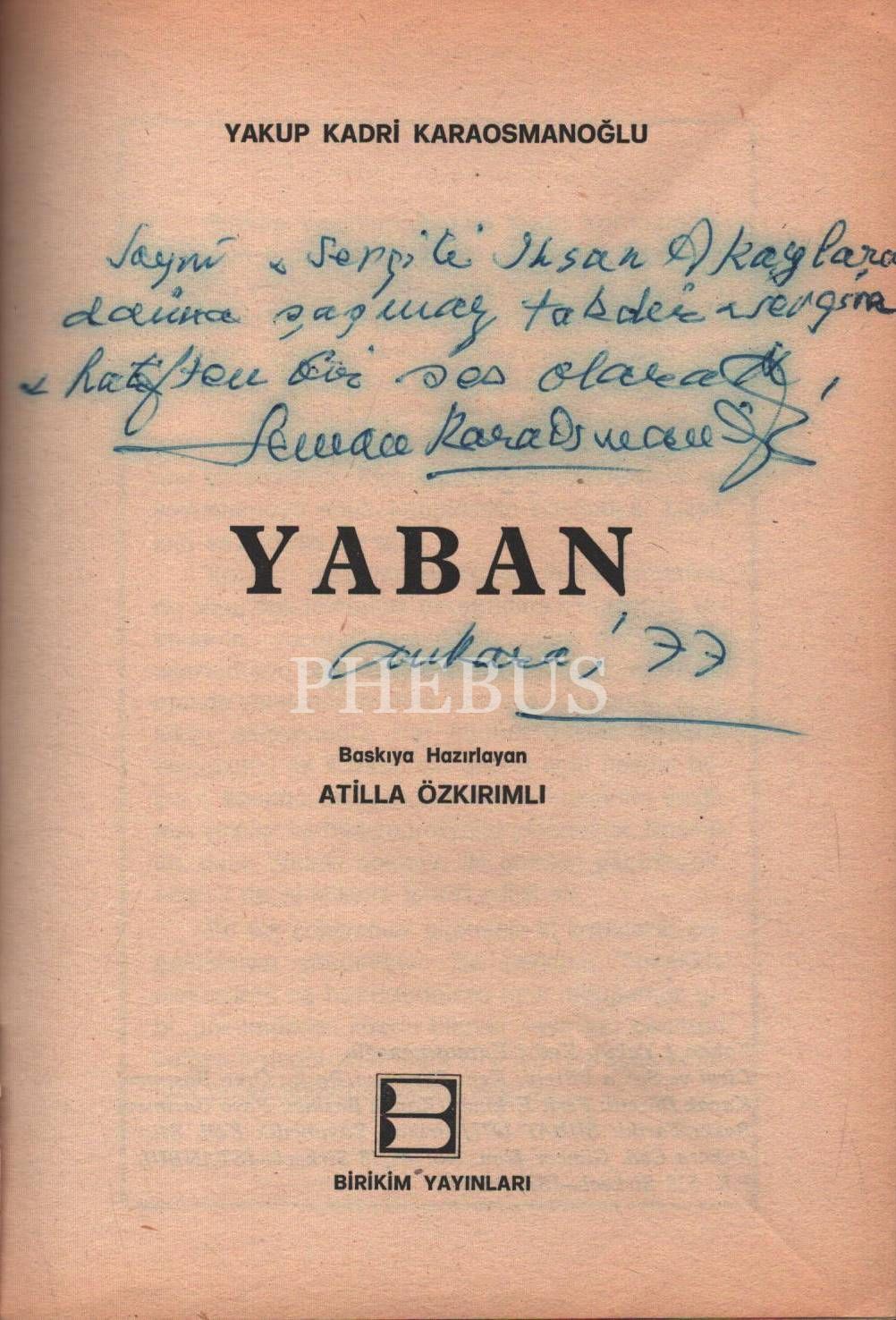 Yakup Kadri Karaosmanoğlu - Bütün Eserleri 1: YABAN, baskıya hazırlayan: Atilla Özkırımlı, 1977, Birikim Yayınları, 295 sayfa, 13x19 cm, Karaosmanoğlu´nun eşi Leman Hanım´dan İTHAFLI VE İMZALI...