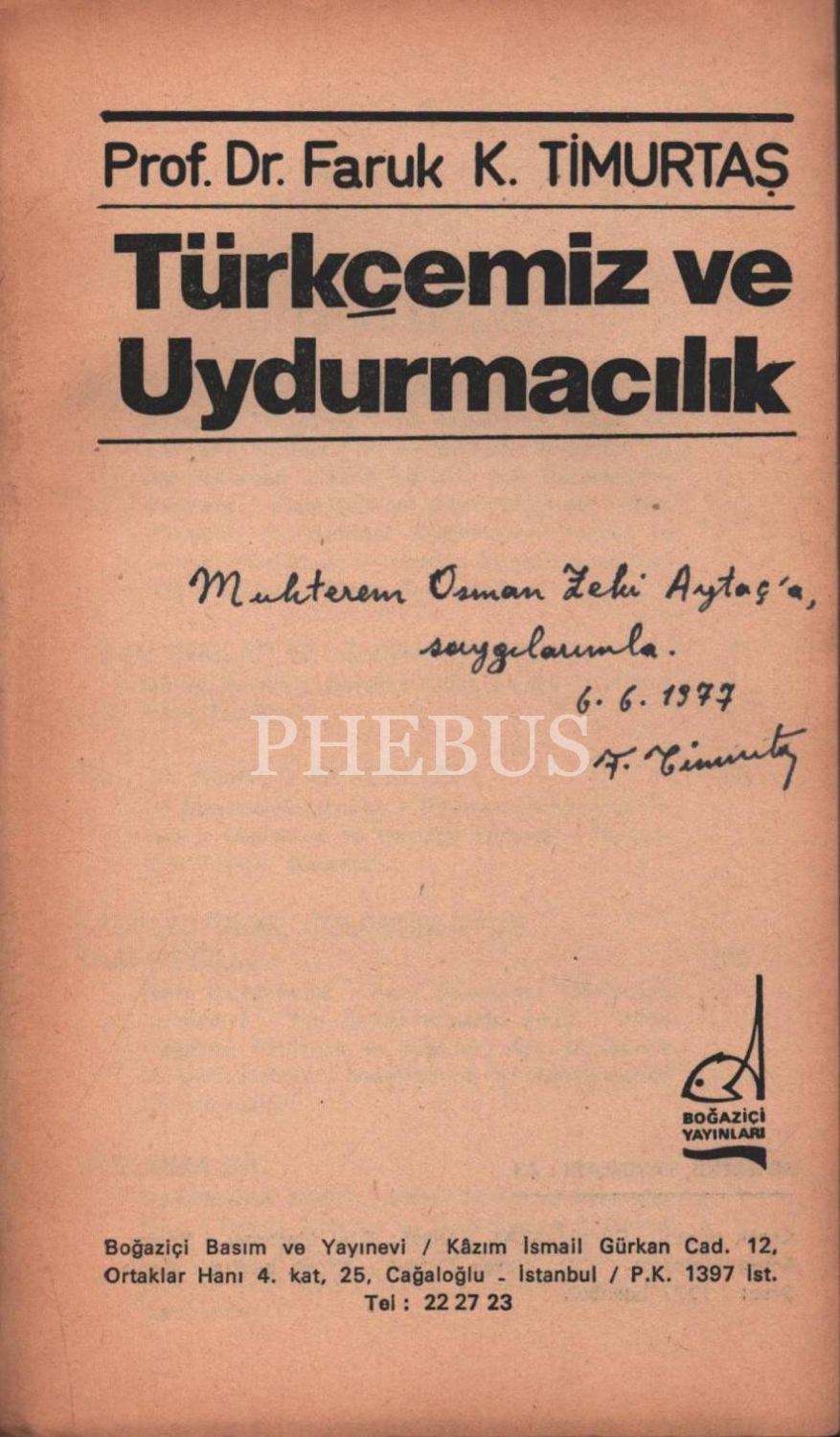 TÜRKÇEMİZ VE UYDURMACILIK, Faruk K. Timurtaş, 1977, Boğaziçi Yayınları, 413 sayfa, 12x20 cm, İTHAFLI VE İMZALI...