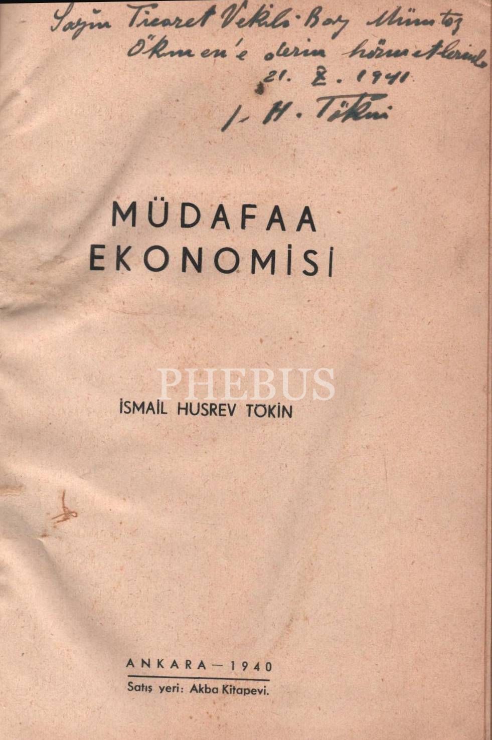 MÜDAFAA EKONOMİSİ, İsmail Hüsrev Tökin, 1940, Akba Kitabevi, 92 sayfa, 14x20 cm, İTHAFLI VE İMZALI...