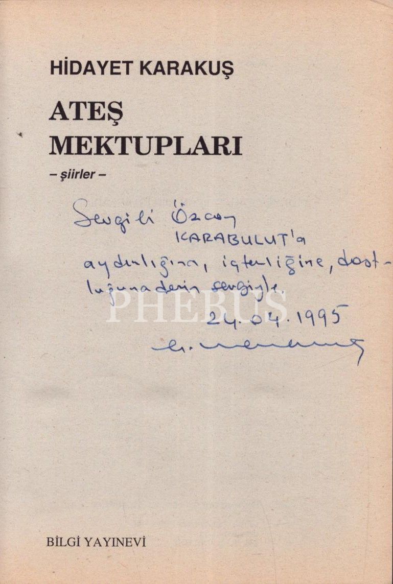 ATEŞ MEKTUPLARI (Şiirler), Hidayet Karakuş, 1995, Bilgi Yayınevi, 111 sayfa, 14x20 cm, İTHAFLI VE İMZALI...