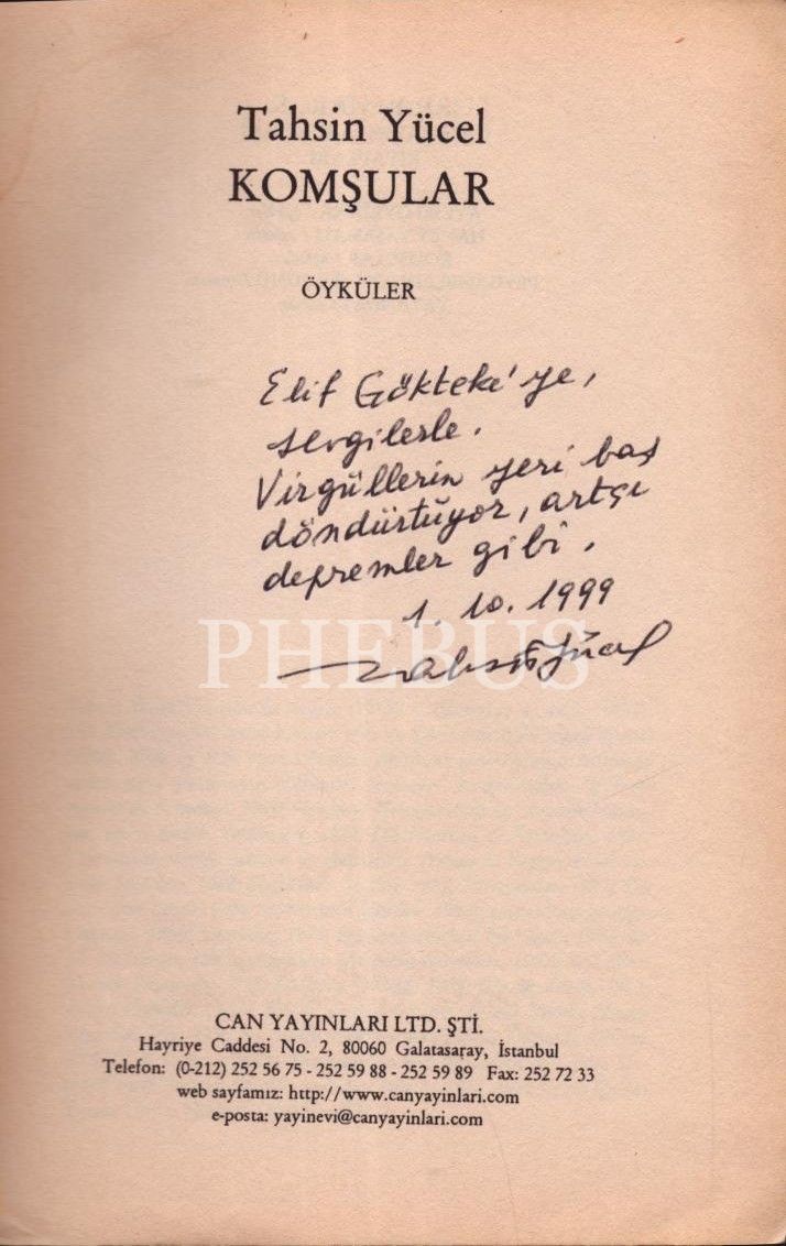 KOMŞULAR (Öyküler), Tahsin Yücel, 1999, Can Yayınları, 127 sayfa, 13x20 cm, İTHAFLI VE İMZALI...