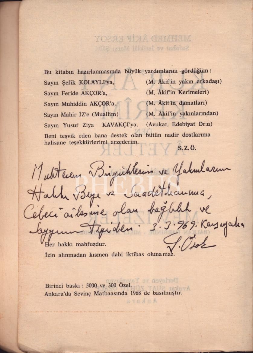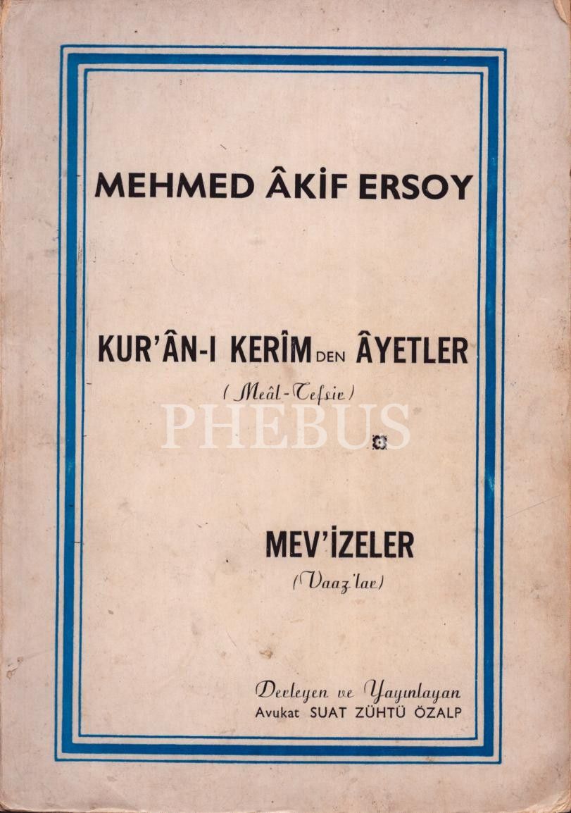 KUR´ÂN-I KERÎM´DEN ÂYETLER, Mehmet Akif Ersoy, derleyen: Suat Zühtü Özalp, 1968, Sevinç Matbaası, 237 sayfa, 13x19 cm, İTHAFLI VE İMZALI...