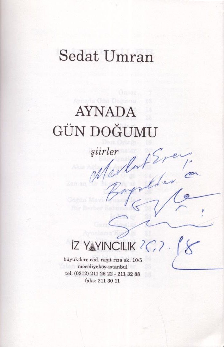 AYNADA GÜN DOĞUMU, Sedat Umran, 1995, İz Yayıncılık, 56 sayfa, 13x19 cm, İTHAFLI VE İMZALI...