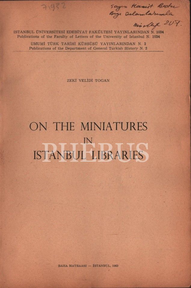 ON THE MINIATURES IN ISTANBUL LIBRARIES, Zeki Velidi Togan, 1963, İstanbul Üniversitesi Edebiyat Fakülesi Yayınları, 68 sayfa, 17x24 cm, İTHAFLI VE İMZALI...