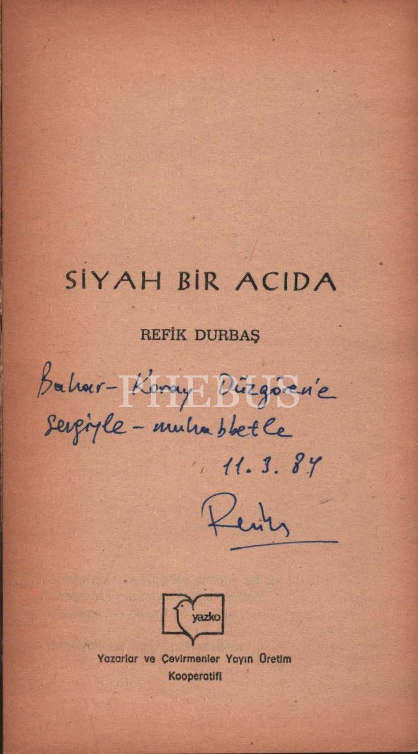 SİYAH BİR ACIDA, Refik Durbaş, 1984, YAZKO ( Yazarlar ve Çevirmenler Yayın Üretim Kooperatifi), 127 sayfa, 11x20 cm, İTHAFLI VE İMZALI...