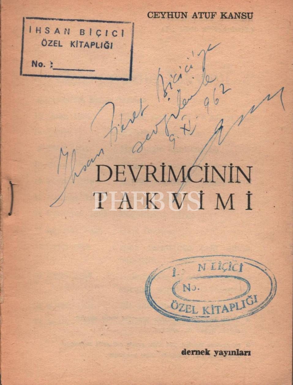 DEVRİMCİNİN TAKVİMİ, Ceyhun Atuf Kansu, Dernek Yayınları, Ankara - Ekim 1962, 83 sayfa, 12x17 cm, İTHAFLI VE İMZALI