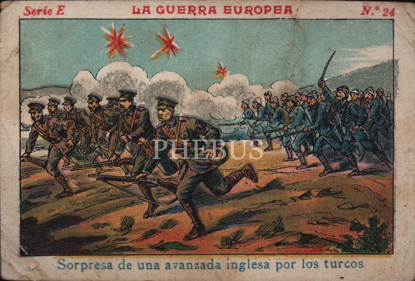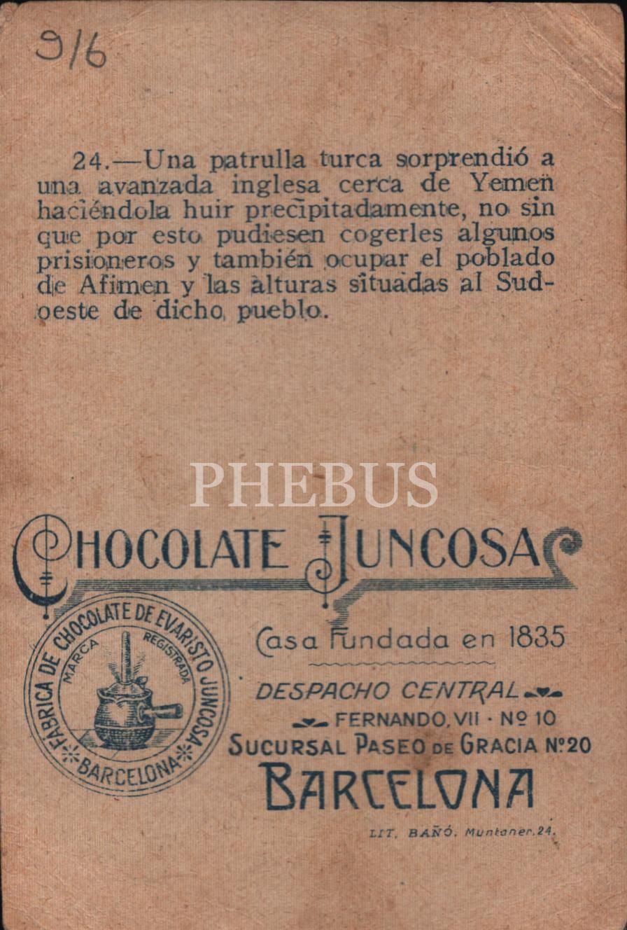 Türkler ve İngilizler cephede çatışırken görselli İspanyolca çikolata kartı, Chocolate Juncosa, Barcelona 1835, 7x11 cm