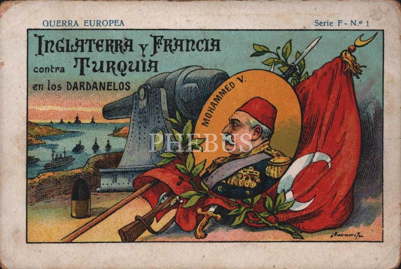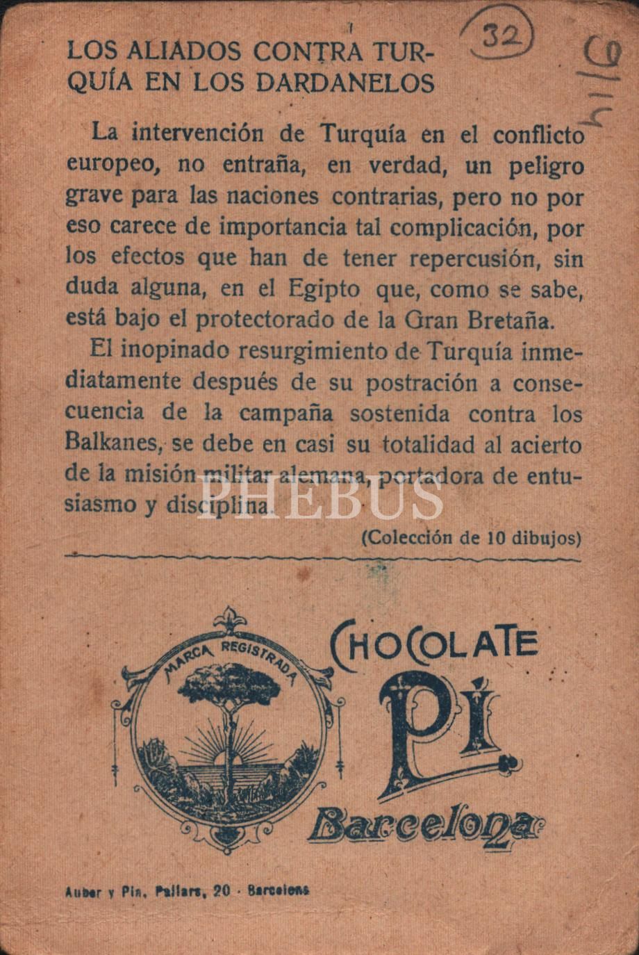 I. Dünya Savaşı Çanakkale Cephesi Sultan Mehmed Reşad görselli İspanyolca çikolata kartı, Chocolate Pi, ed. Auber y Pin, 7x11 cm