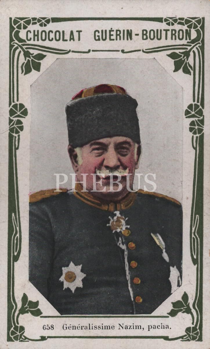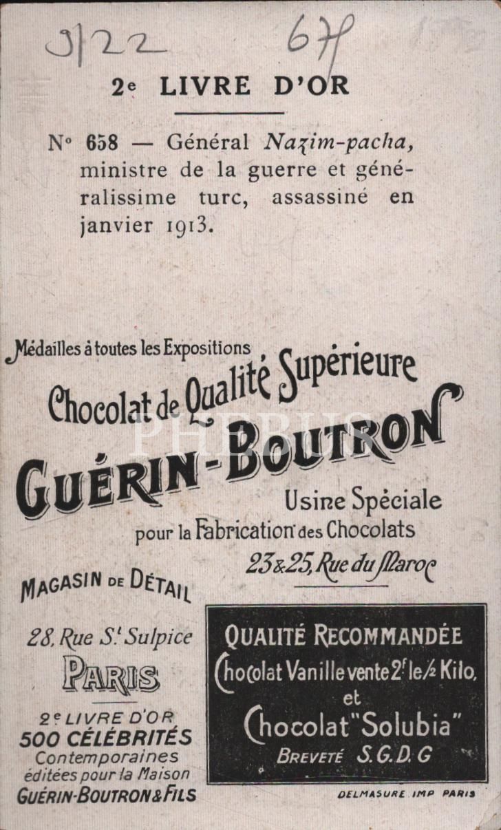 Harbiye Nazırı Hüseyin Nâzım Paşa görselli Fransızca çikolata kartı, Chocolat Guérin-Boutron, ed. Delmasure, Paris, 7x11 cm