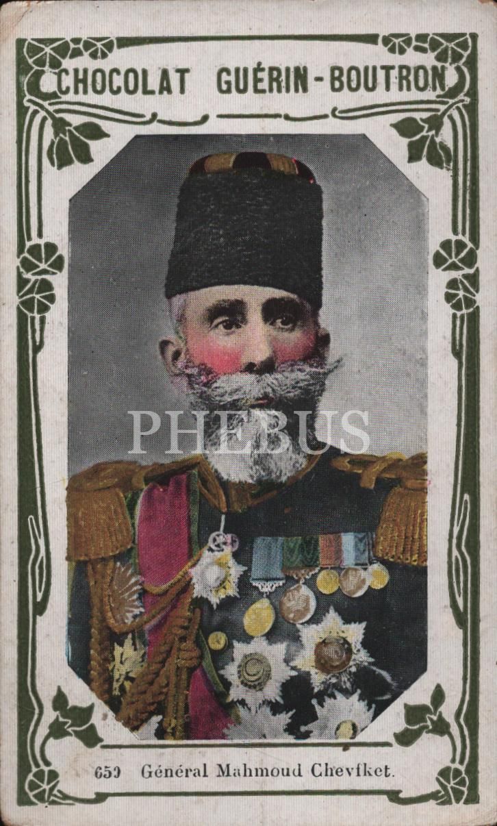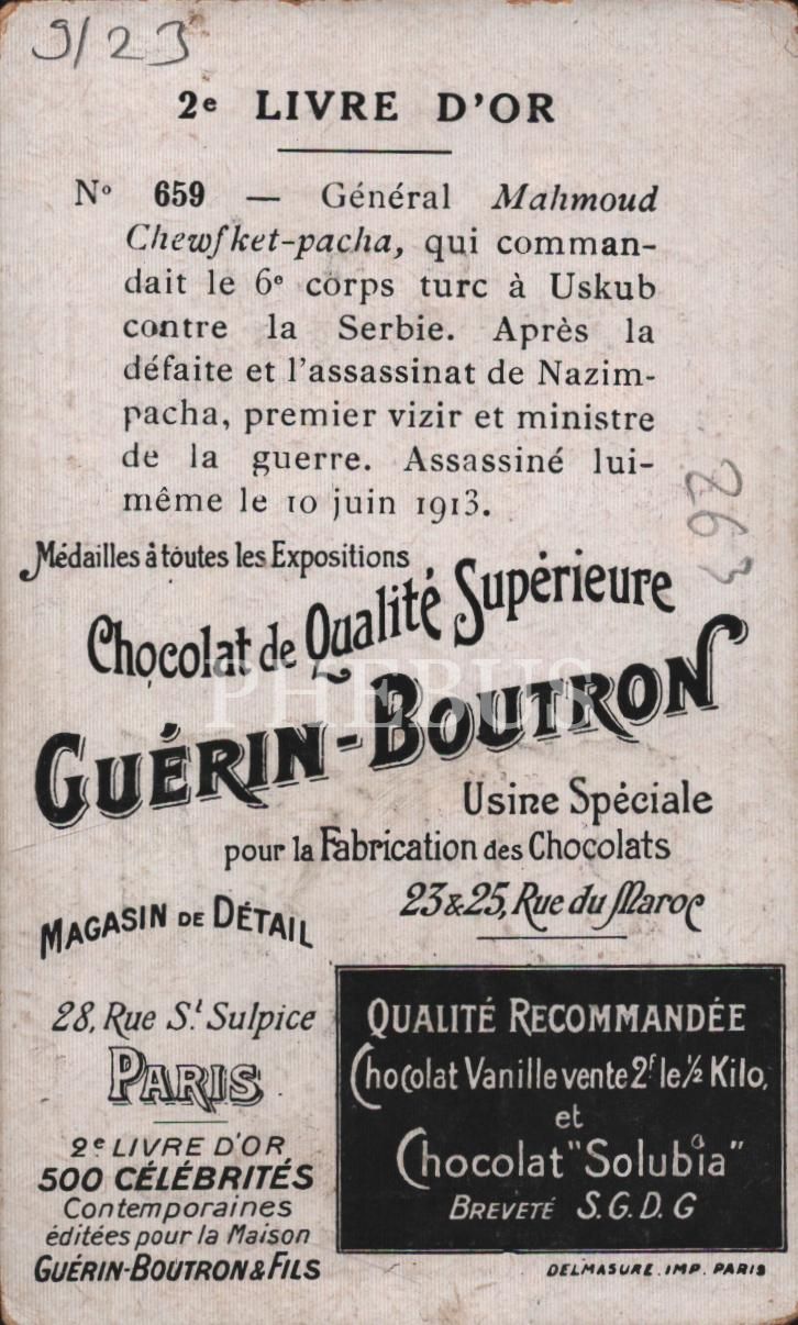 Harbiye Nazırı Mahmud Şevket Paşa Paşa görselli Fransızca çikolata kartı, Chocolat Guérin-Boutron, ed. Delmasure Imp. Paris, 7x11 cm