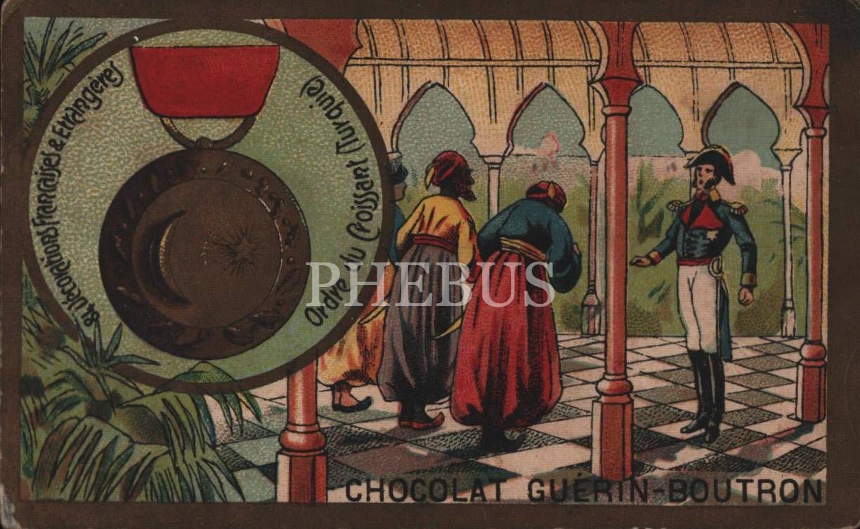 Osmanlı Nişanı görselli Fransızca çikolata kartı, Chocolat Guérin-Boutron, ed. Herold, Paris, 7x11 cm