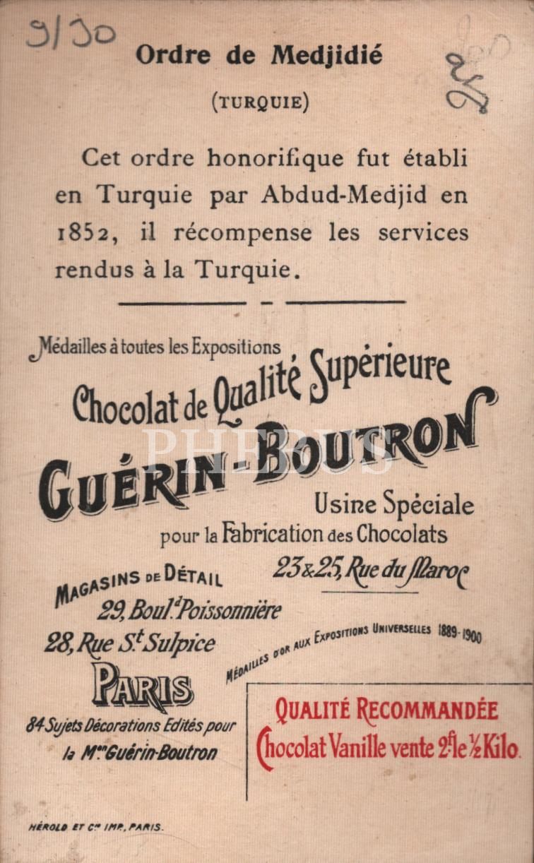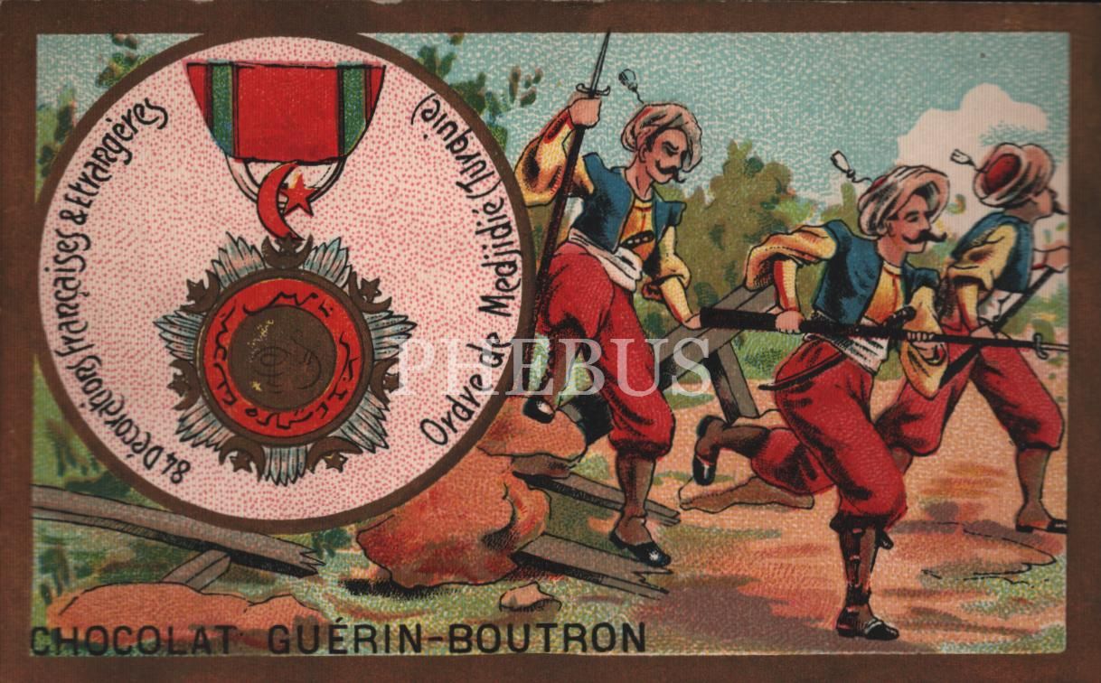 Mecidiye Nişanı görselli Fransızca çikolata kartı, Chocolat Guérin-Boutron, ed. Herold Imp. Paris, 7x11 cm