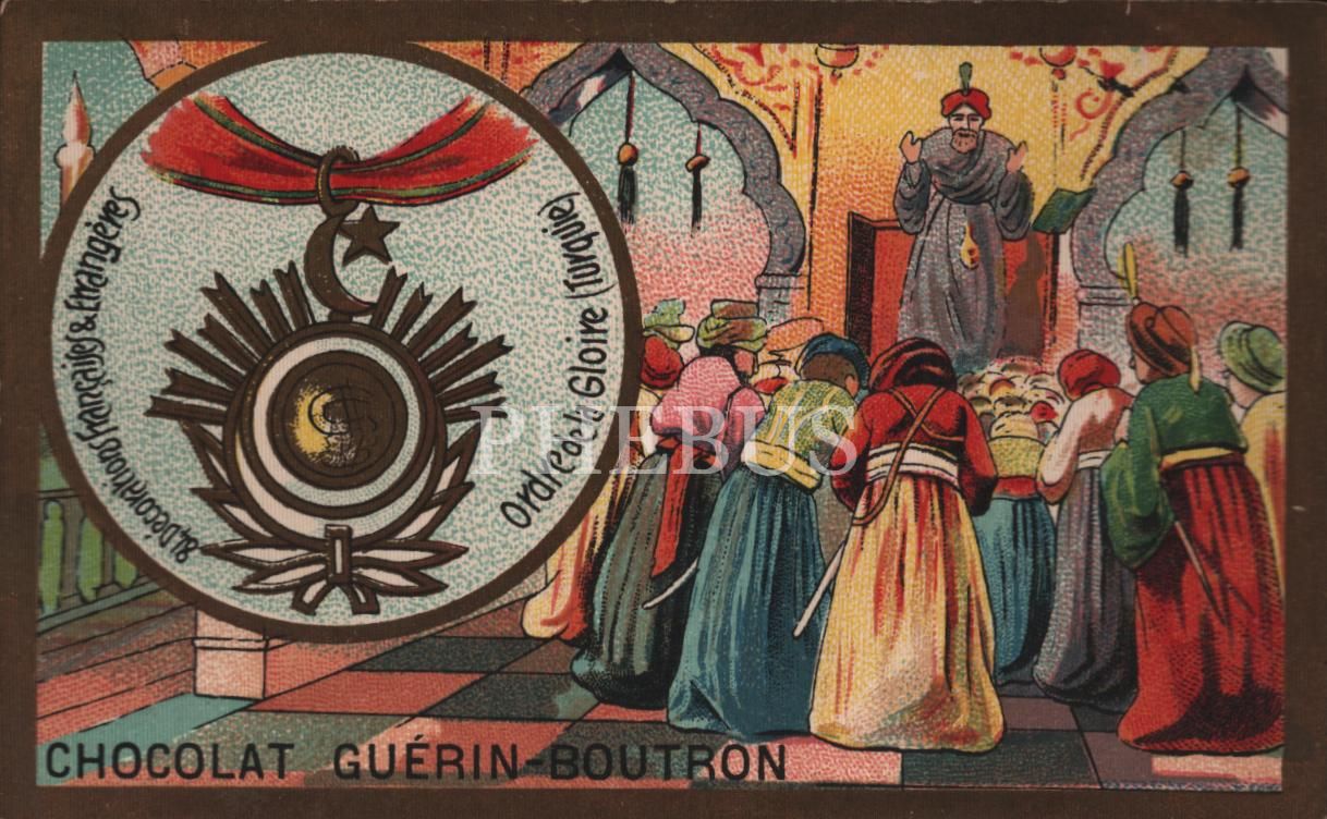 Zafer Nişanı görselli Fransızca çikolata kartı, Chocolat Guérin-Boutron, ed. Herold, Paris, 7x11 cm