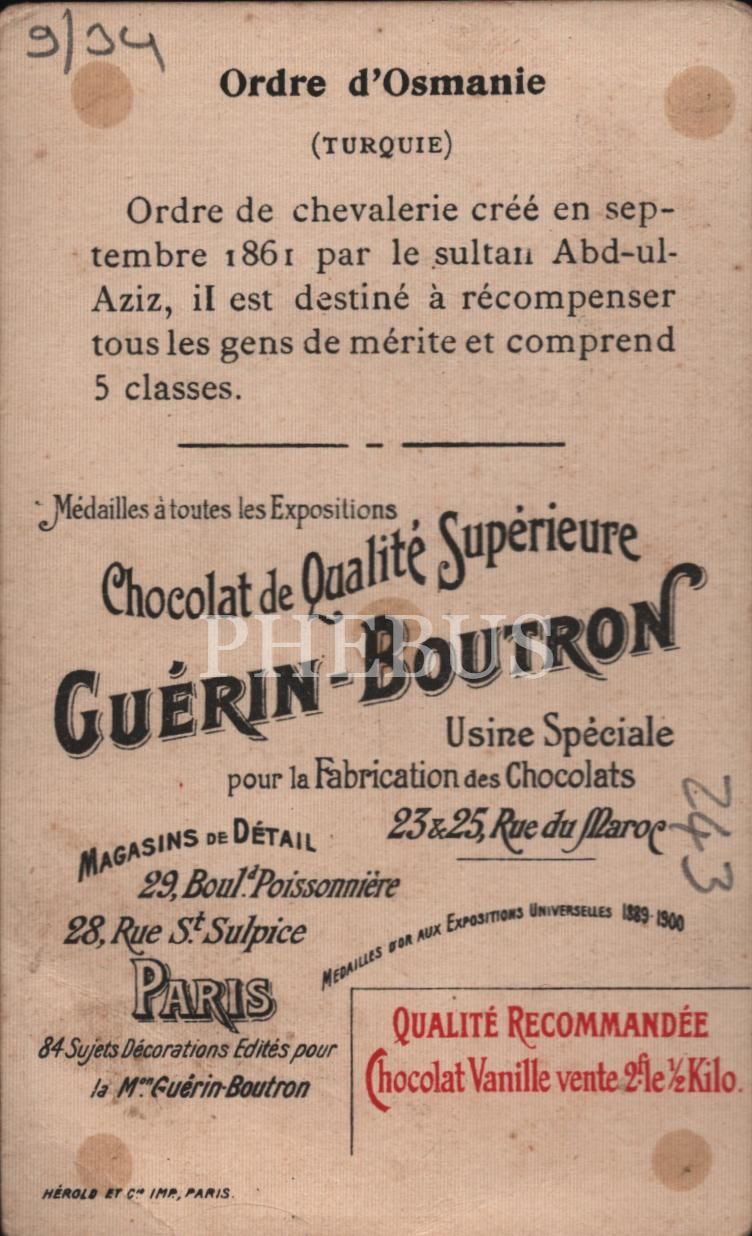 Osmaniye Nişanı görselli Fransızca çikolata kartı, Chocolat Guérin-Boutron, ed. Herold, Paris, 7x11 cm