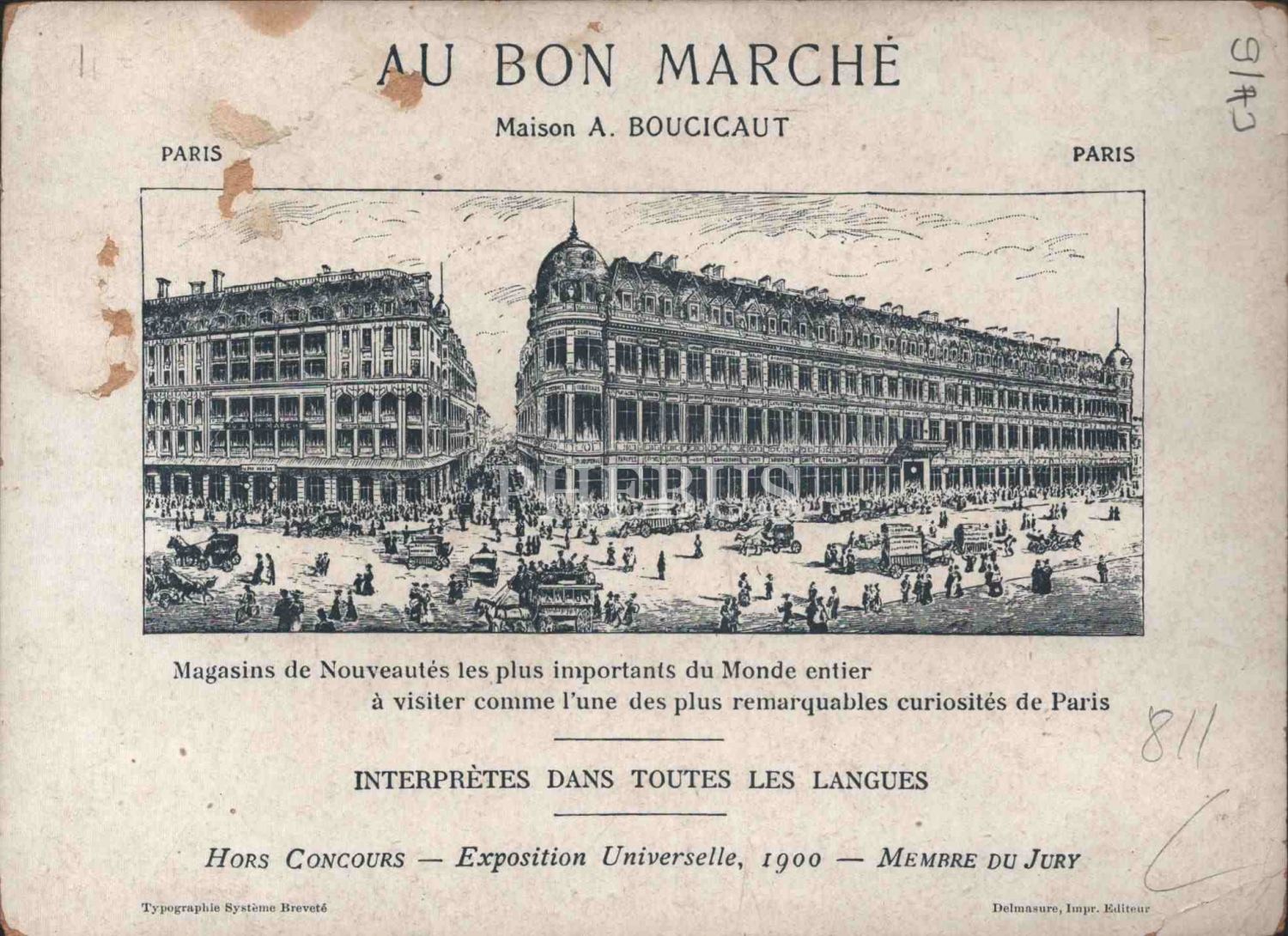 Au Bon Marche, birbirinden farklı çok sayıda ürünü bir arada satan, dönemin ilk büyük mağaza girişimidir. Kartpostallar da bu mağazadan çıkmaktadır. Bir tanesinin sağ üst köşesinde ufak bir kopuk mevcut haliyle.