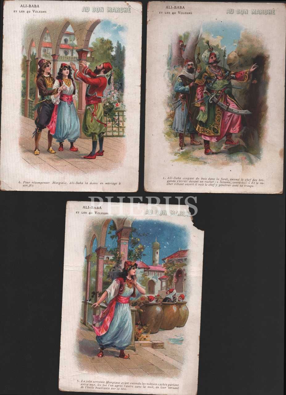 Ali Baba görselli 3 adet ticaret kartı, Au Bon Marche, ed.Delmasure, Paris, 12x17 cm