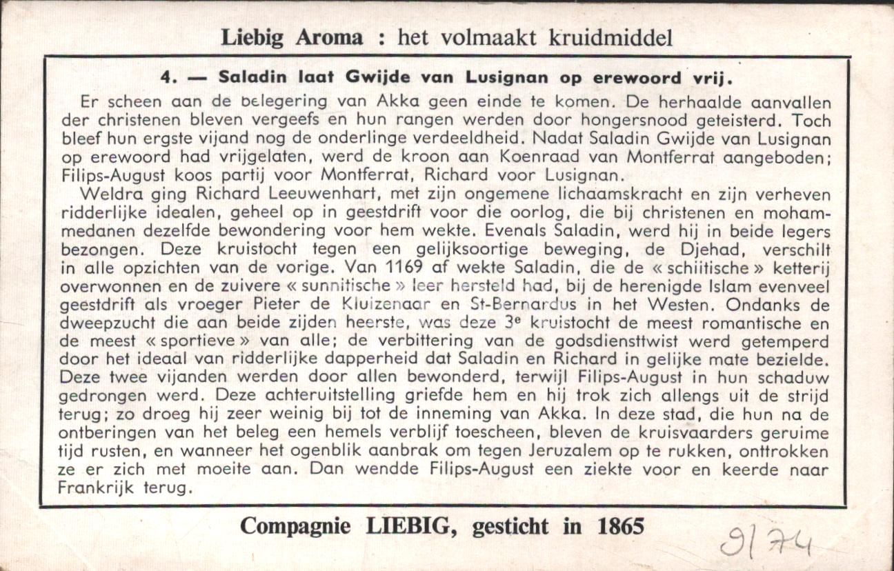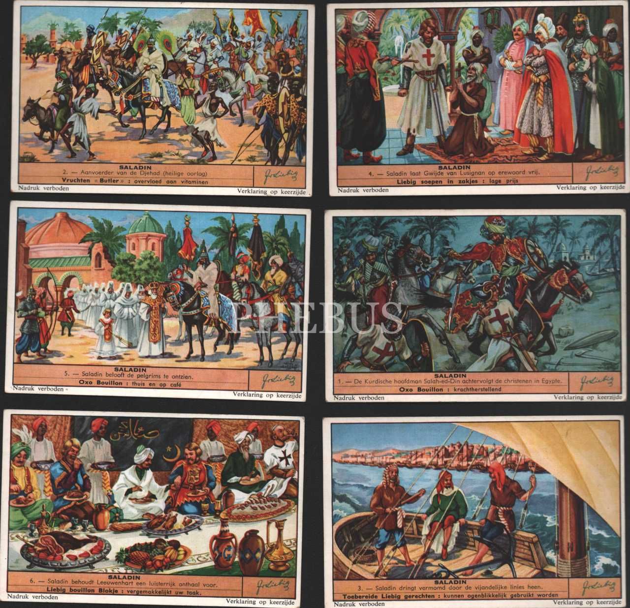 Selahaddin Eyyubi ve Haçlı ordu görselli 6 adet Liebig et özü kartı, ed. Nadruk Verboden, Liebig Et Şirketi 1865, 7x11 cm