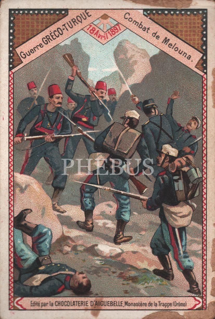 "Yunan-Türk savaşı Melouna Muharebesi (18 Nisan 1897)" görselli Fransızca çikolata kartı, Chocolat D´Aiguebelle, 7x10 cm