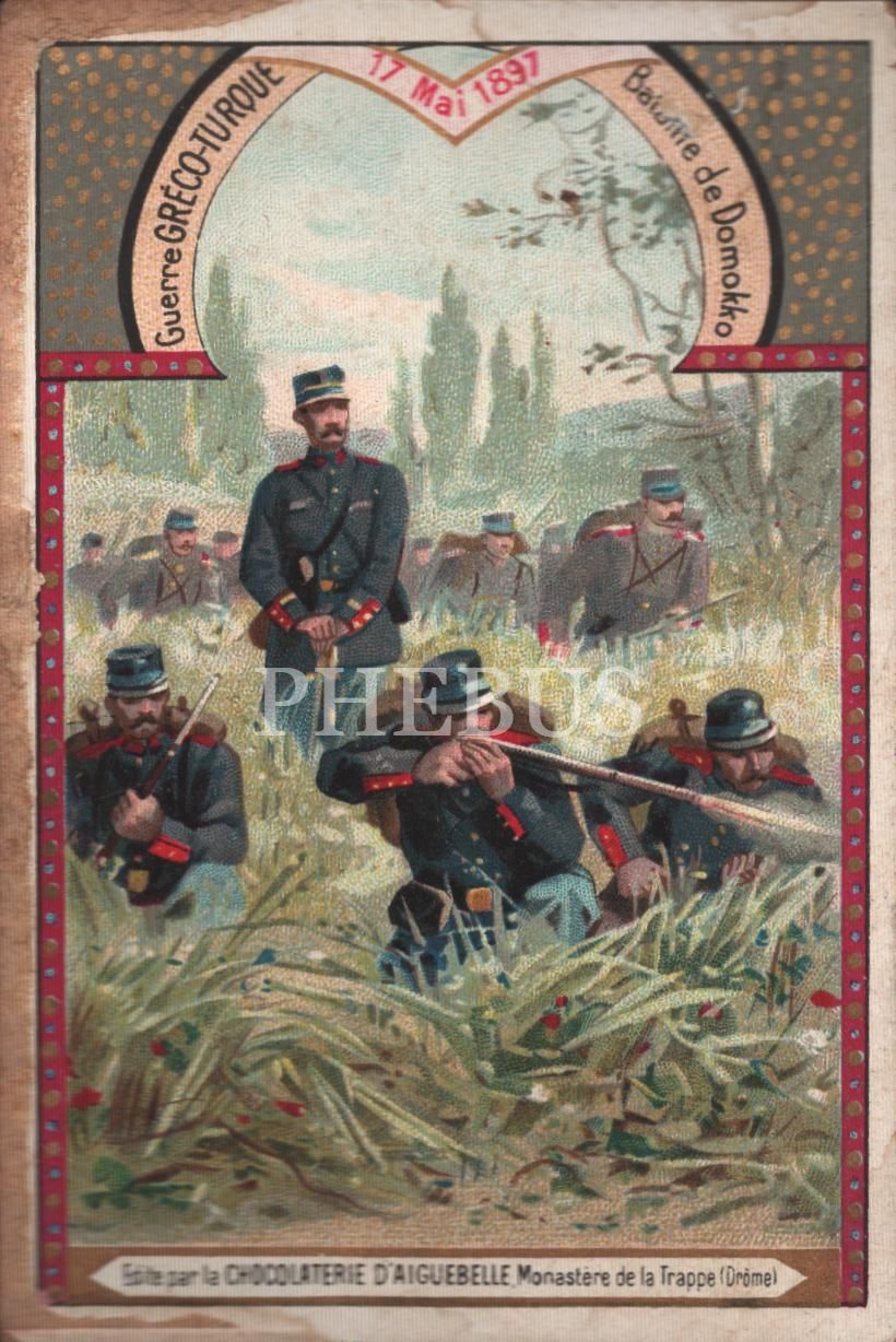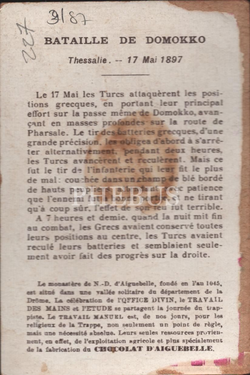 "Yunan-Türk savaşı Dömeke Muharebesi (17 Mayıs 1897)" görselli Fransızca çikolata kartı, Chocolat D´Aiguebelle, 7x10 cm