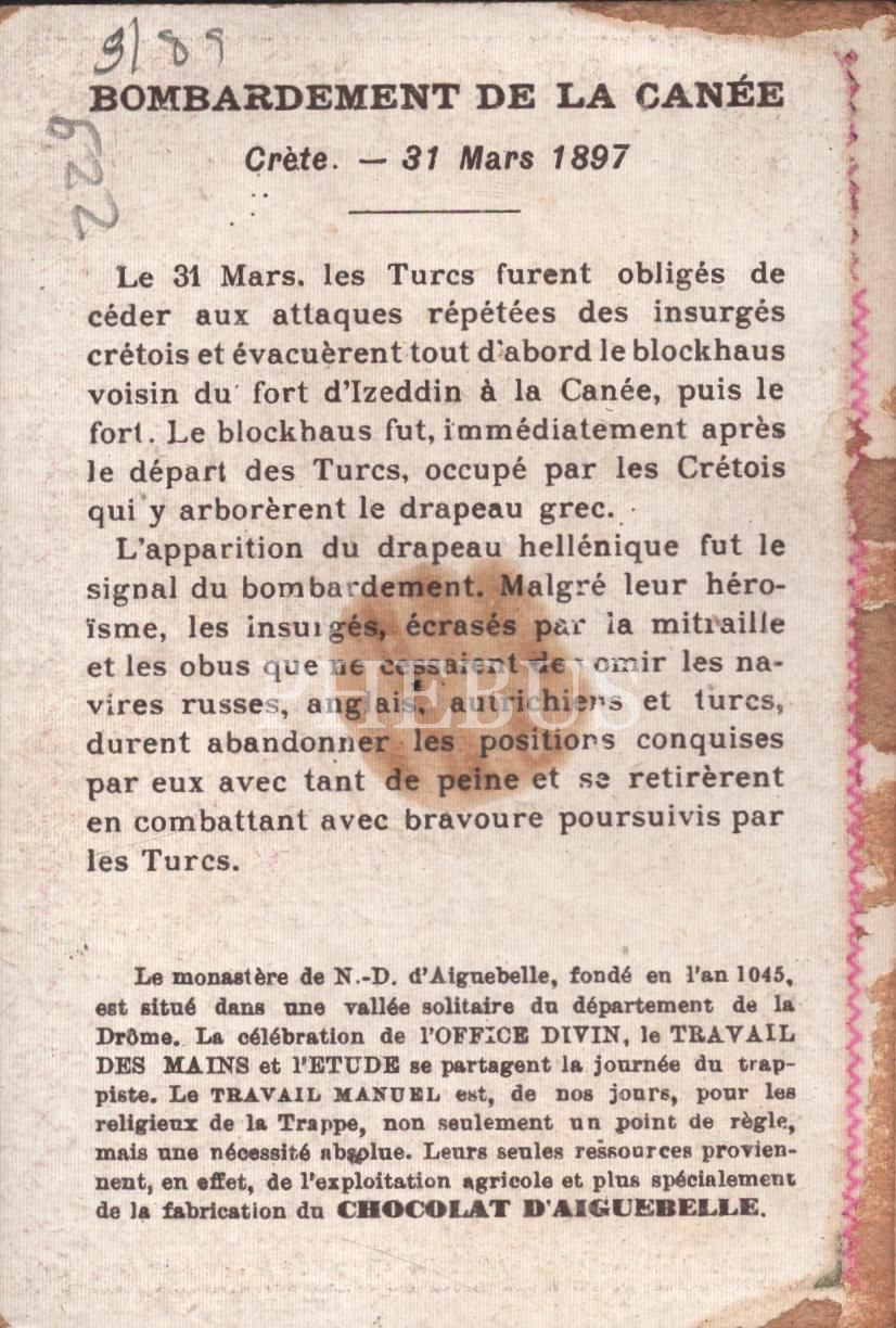 "Yunan-Türk savaşı Hanya´nın bombardımanı (28 Mart 1897)" görselli Fransızca çikolata kartı, Chocolat D´Aiguebelle, 7x10 cm