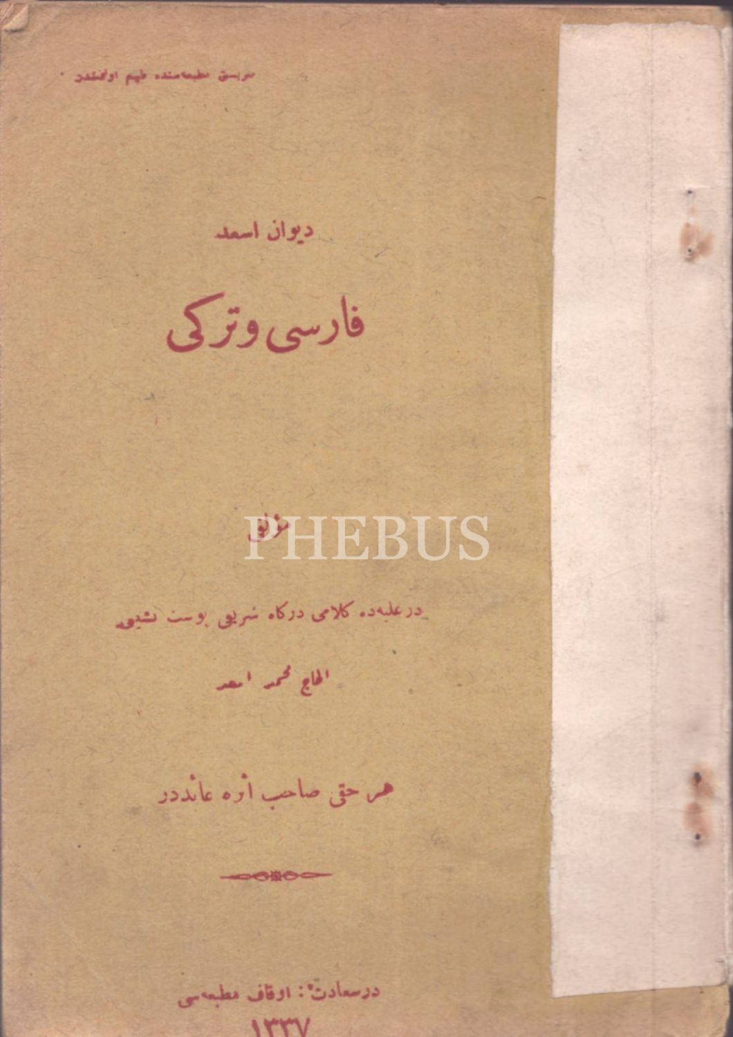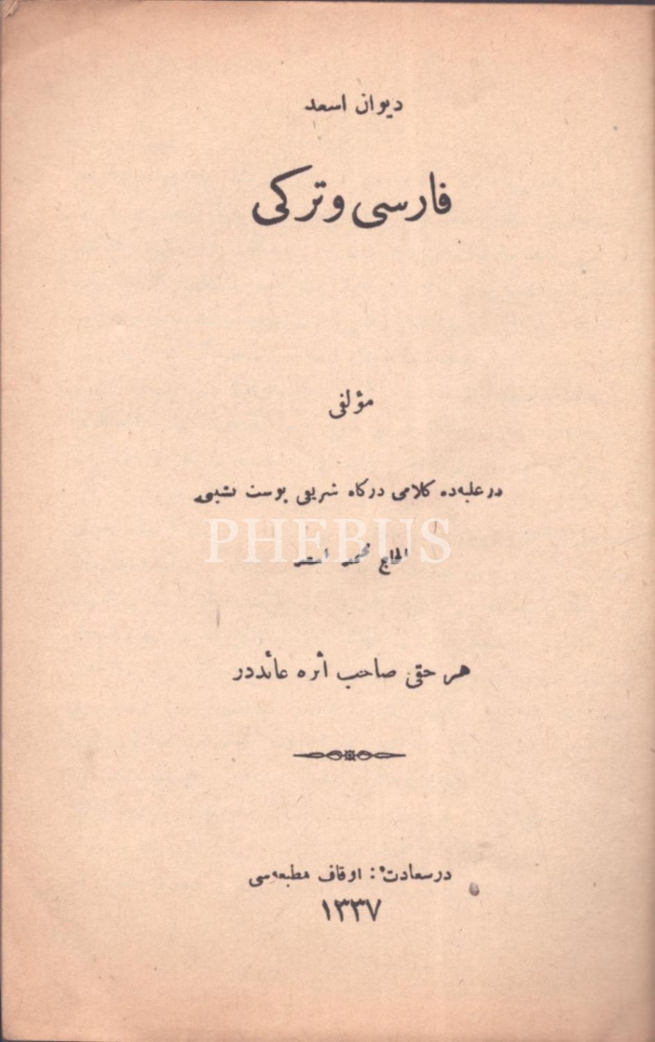 DÎVÂN-I ES´AD (Fârisî ve Türkî), el-Hac Mehmed Esad, Evkaf Matbaası, İstanbul 1337, 64+4 s., 14x20 cm