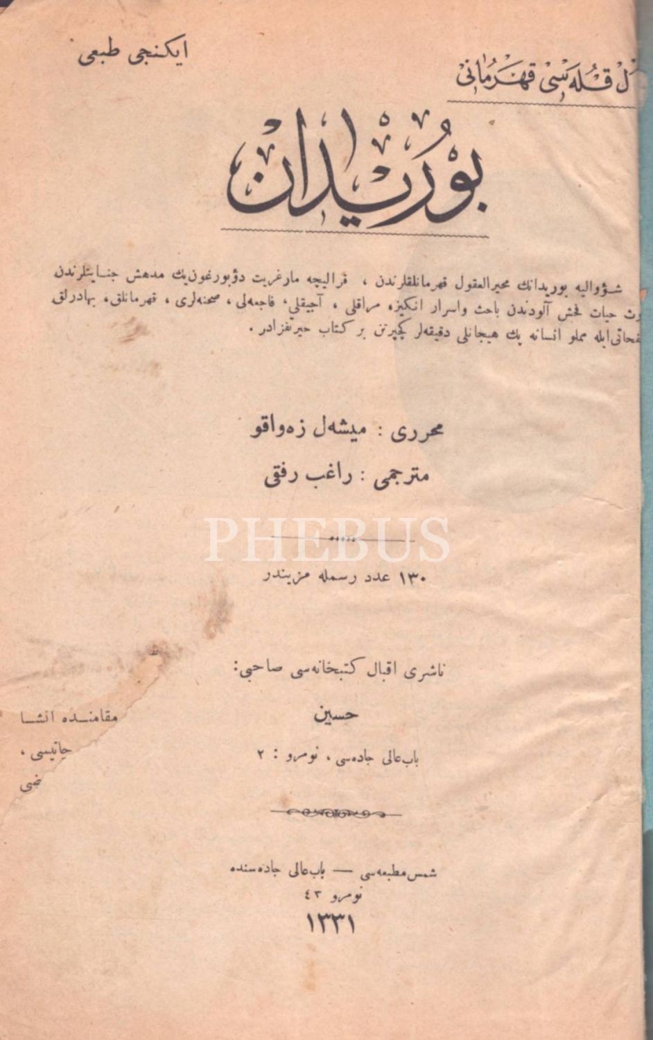 BUREYDÂN, Michel Zevaco, çev. Rafıb Rıfkı, Şems Matbaası, İstanbul 1331, 927 s., 17x24 cm