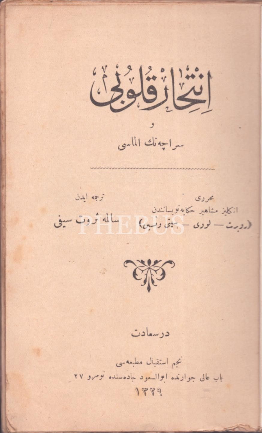 İNTİHÂR KULÜBÜ VE SERRÂÇENİN ELMASI, Robert Louis Stevenson, çev. Salime Servet Seyfi, Necm-i İstikbâl Matbaası, İstanbul 1329, 246 s., 12c18 cm