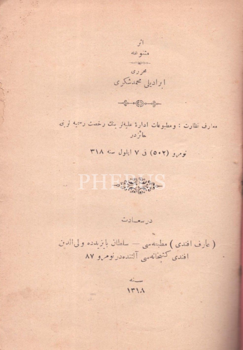ESER-İ MÜTENEVVİA, Ebradilî Mehmed Şükrü, Arif Efendi Matbaası, İstanbul 1318, 61 s., 13x20 cm