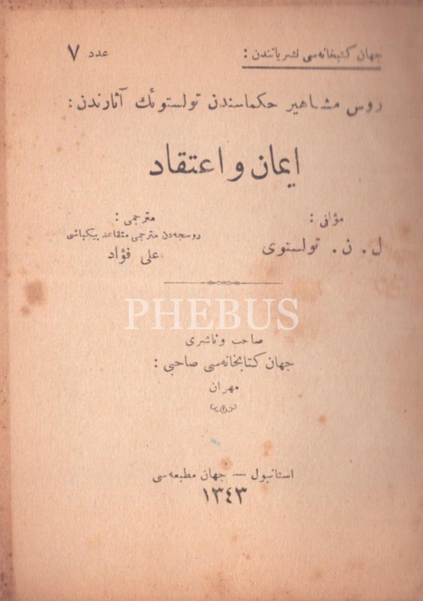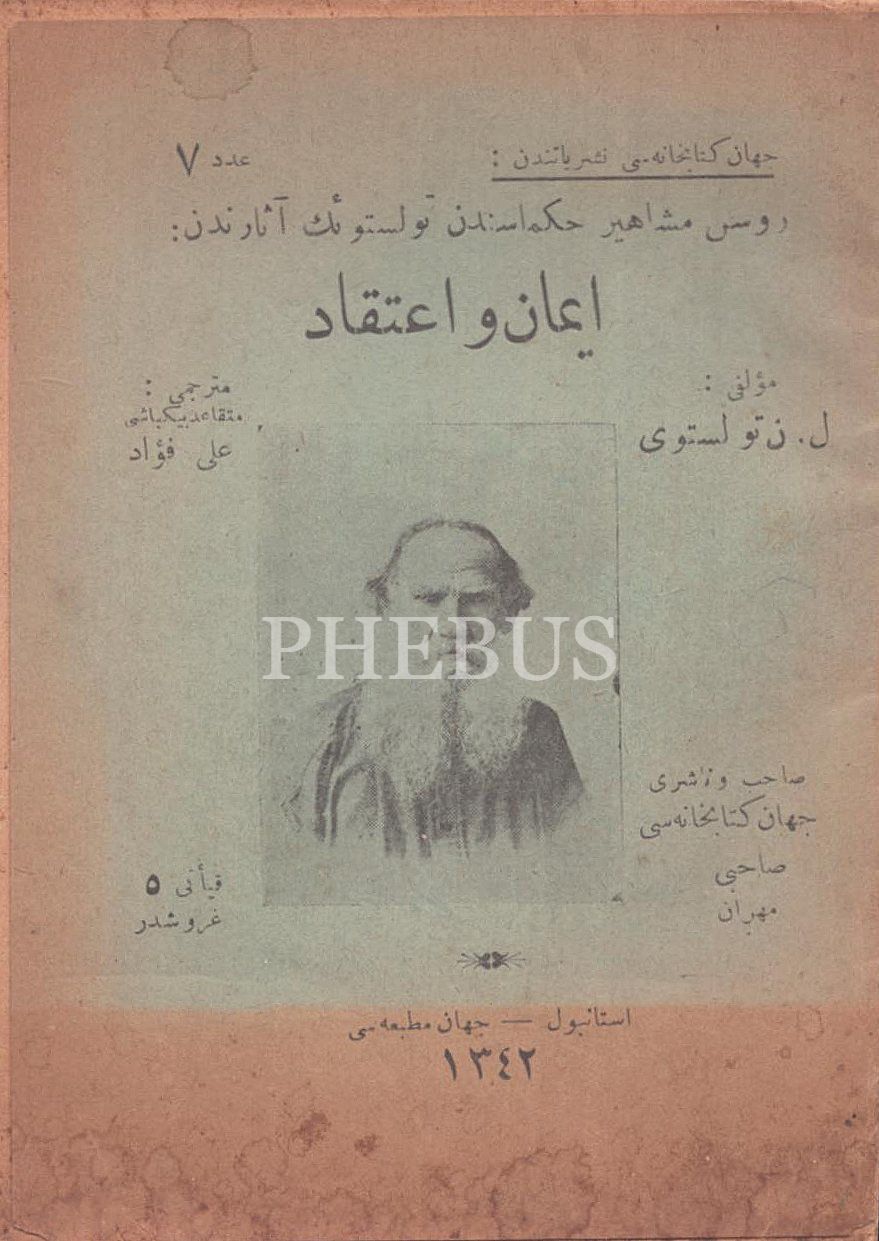 L. N. Tolstoy´a ait 2 eser bir arada: ÎMÂN VE İTİKÂD ile VİCDÂN, çev. Ali Fuad, Cihan Matbaası, İstanbul 1342-43, 24+31 s., 12x16 cm