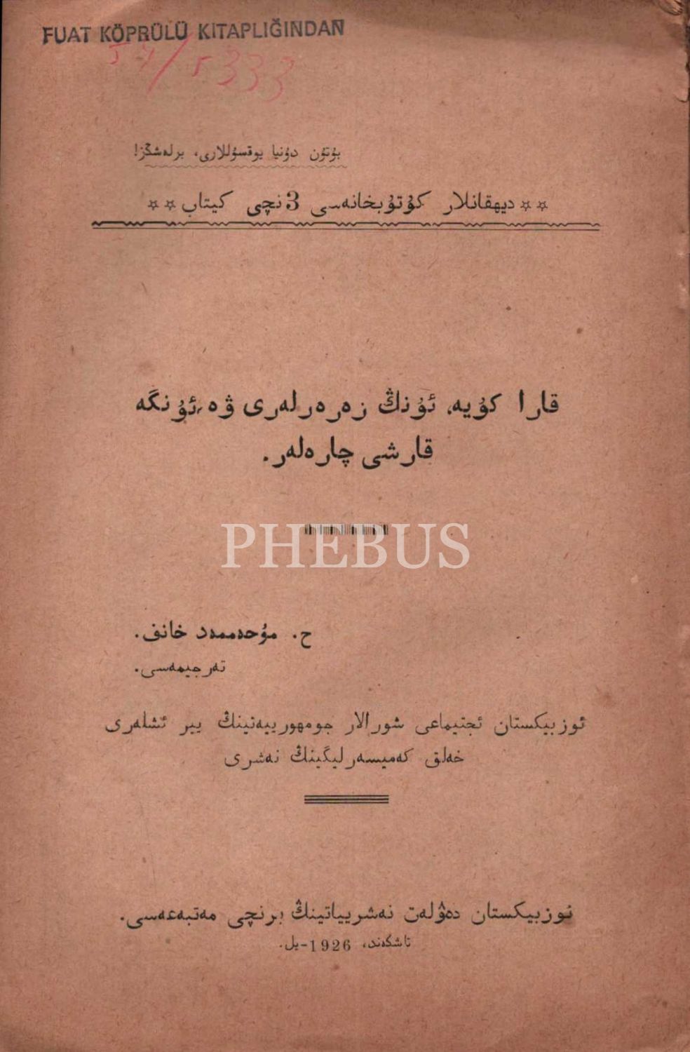 Fuat Köprülü Kitaplığından KARA KÜYE [GÜVE], ONUN ZARARLARI VE ONGA [ONA] KARŞI ÇARELER, V. Şegeyef, çev. H. Muhammed Hânif, Özbekistan Devlet Neşriyatı, Taşkent 1926, 26 s., 15x23 cm
