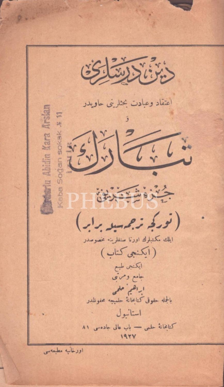 DÎN DERSLERİ VE TEBÂREKE CÜZ-İ ŞERÎFİ (Türkce Tercümesiyle Berâber), haz. İbrahim Hilmi, Kitabhane-i Hilmi, İstanbul 1927, 78+32 s., 14x22 cm