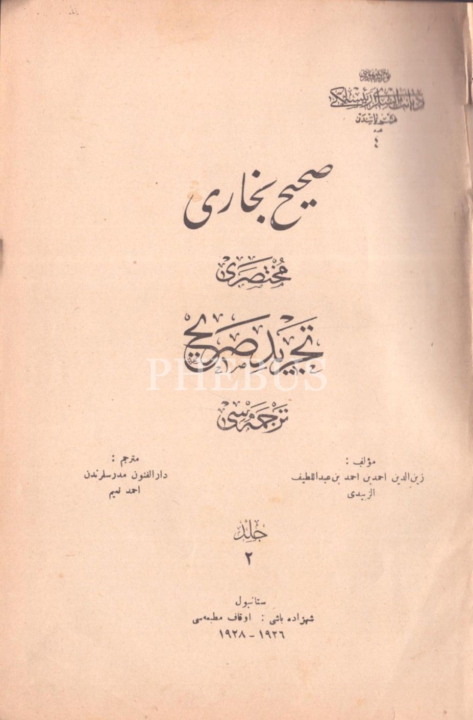 SAHÎH-İ BUHÂRÎ MUHTASARI TECRÎD-İ SARÎH TERCÜMESİ (2. Cilt), Zeyneddin Ahmed ez-Zebîdî, çev. [Babanzâde] Ahmed Naim, Evkaf Matbaası, İstanbul 1928, 201 ilâ 761. sayfalar, 17x25 cm