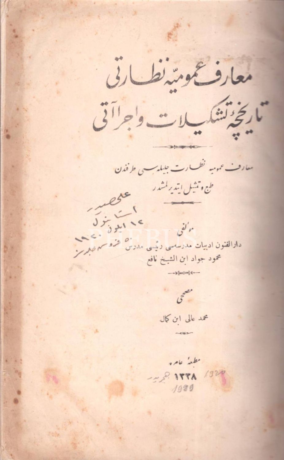 MAÂRİF-İ UMÛMİYYE NEZÂRETİ TÂRÎHÇE-İ TEŞKÎLÂT VE İCRÂÂTI, Mahmud Cevad İbnü´ş-Şeyh Nâfi´, tashih eden: Mehmed Âli İbn Kemal, Matbaa-i Âmire, 1338, 524 s., 17x25 cm