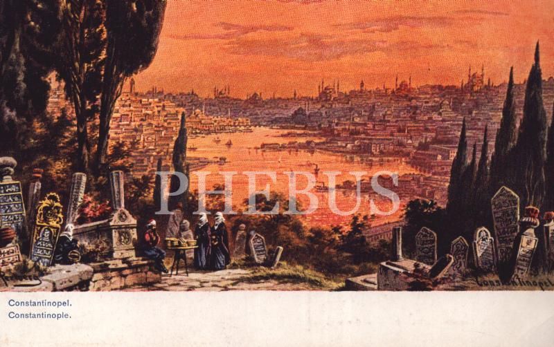Mezarlıklar, kadınlar ve simitçi görselli Alman taşbaskı kartpostal, ed. CA